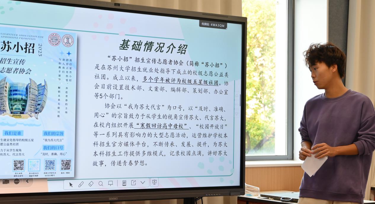 高鹏同学代表“苏小招”,对学院在招生宣传工作中的支持表示感谢。他向在场师生介绍了“苏小招”招生宣传志愿者协会,并分享了苏大学生寒假回访高中母校活动的准备与成果。他鼓励同学们积极加入“苏小招”,利用假期返回母校,将苏大的学习生活体验分享给学弟学妹,助力学校吸引优秀生源。