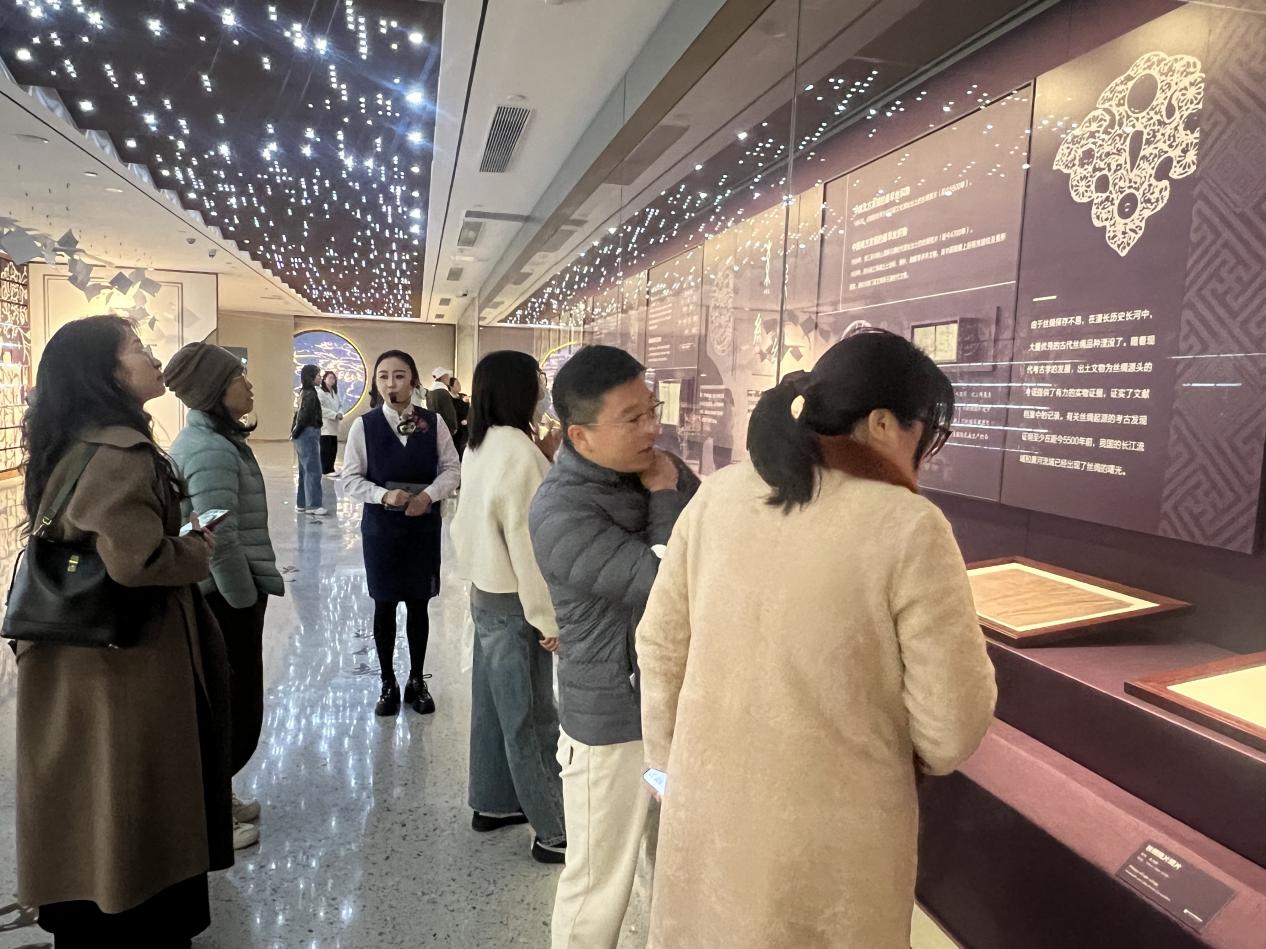 首先参观中国丝绸档案馆,丰富的馆藏档案生动展现了中国丝绸文化的千年脉络与匠心传承。大家在讲解员带领下,观摩从汉代织锦到明清缂丝,从非遗技艺档案到当代丝绸创新成果,感悟丝绸产业与国家命运同频共振的红色印记,进一步筑牢初心使命。