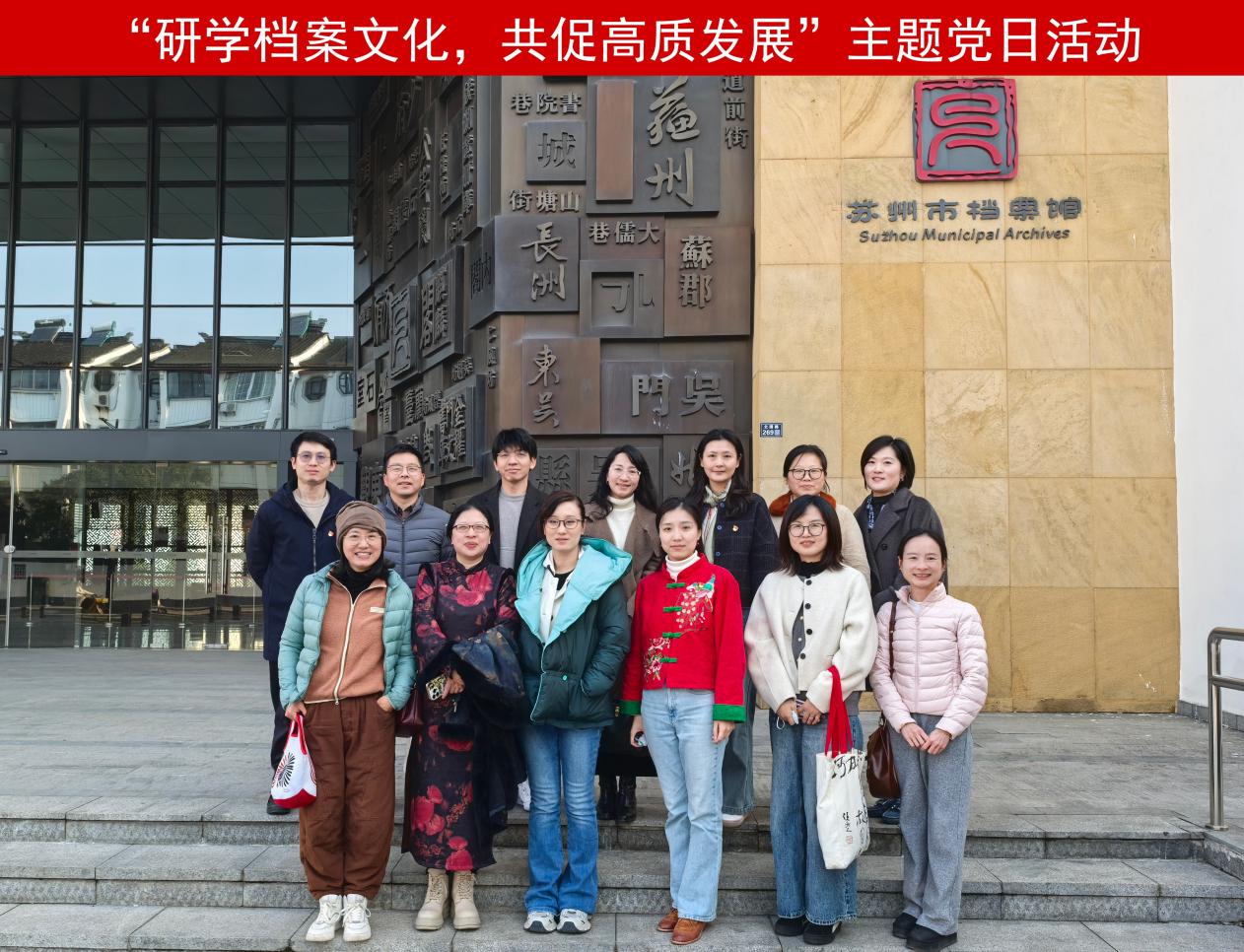 为深入学习贯彻党的二十大精神,深化党建与业务融合,厚植文化自信,3月19日艺术学院教工一支部、教工二支部组织党员赴苏州市档案馆开展“研学档案文化,共促高质发展”主题党日活动。活动以搭建交流平台、学习档案知识、促进文化互鉴为目的,通过实地参观、专题讲座、艺术分享等形式,搭建跨领域交流平台,为高质量发展注入新活力。