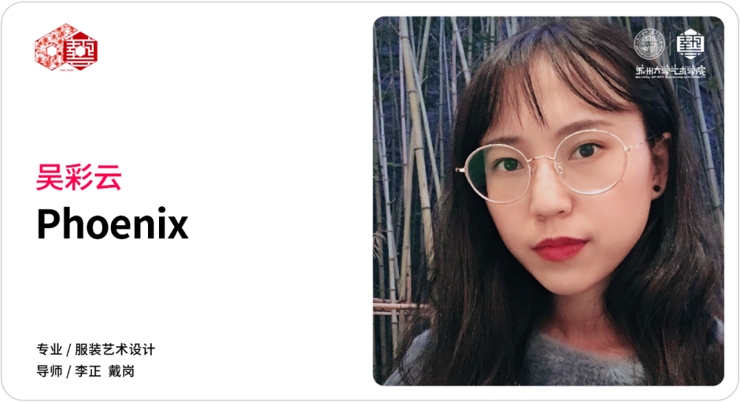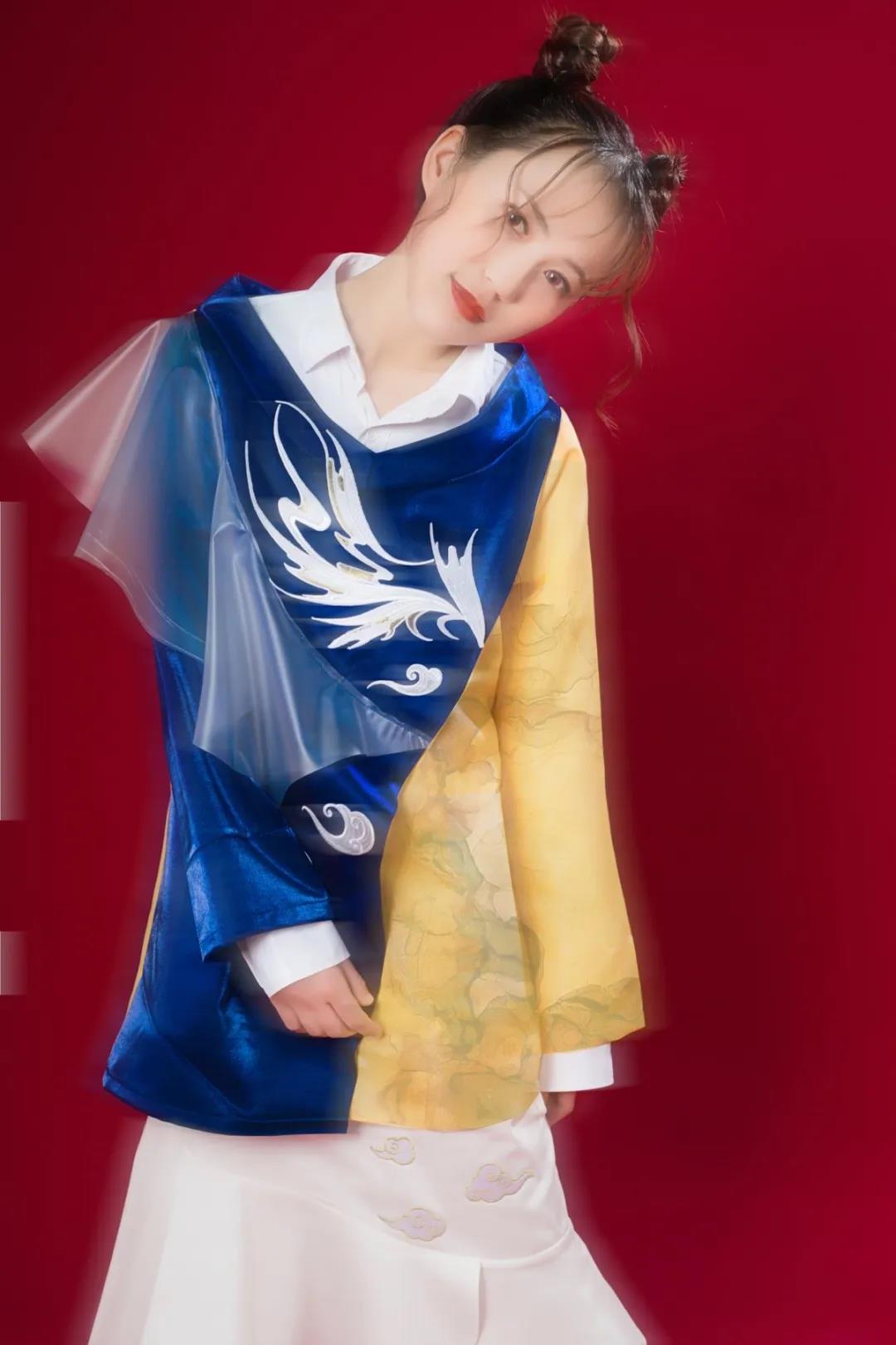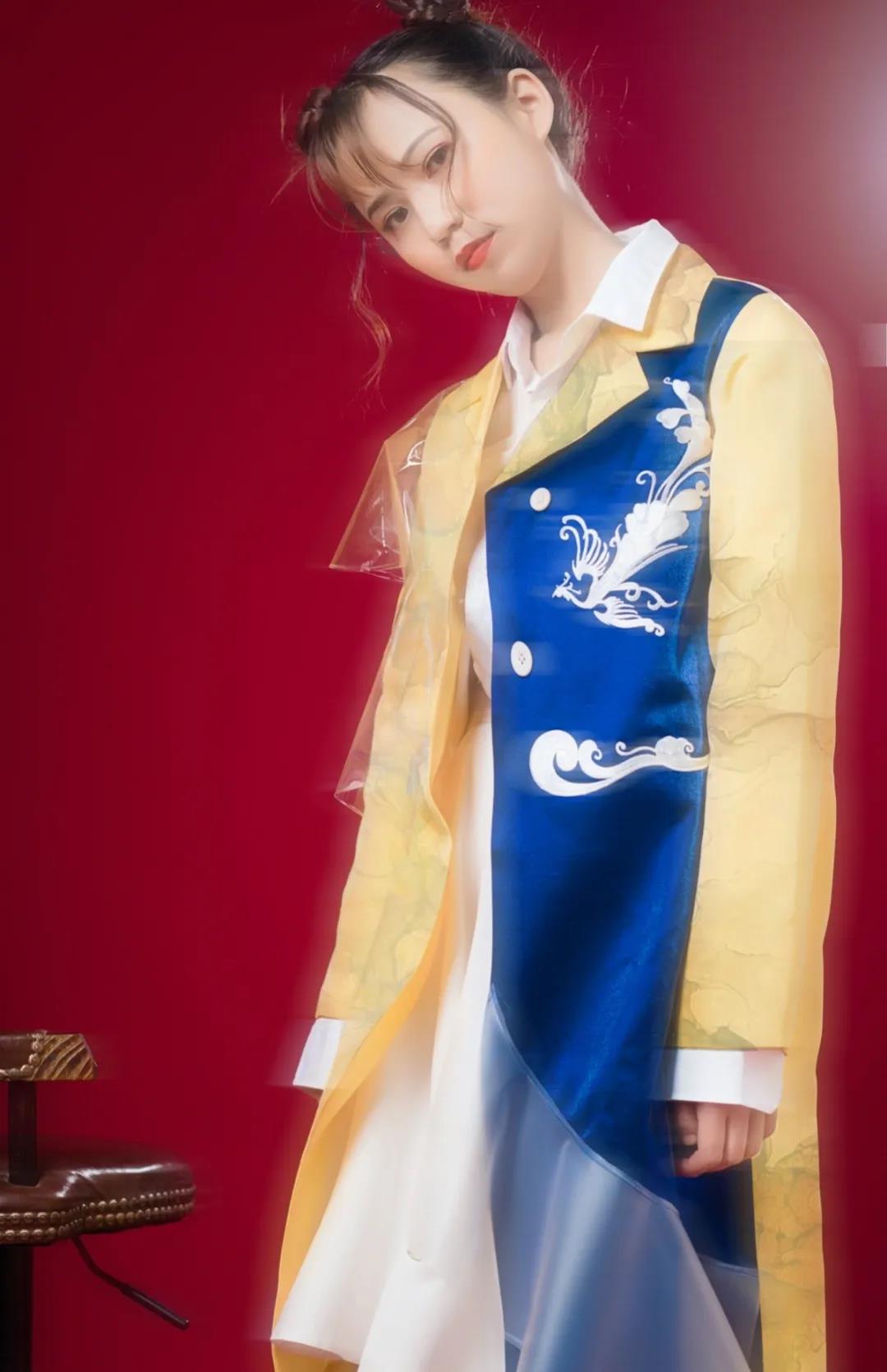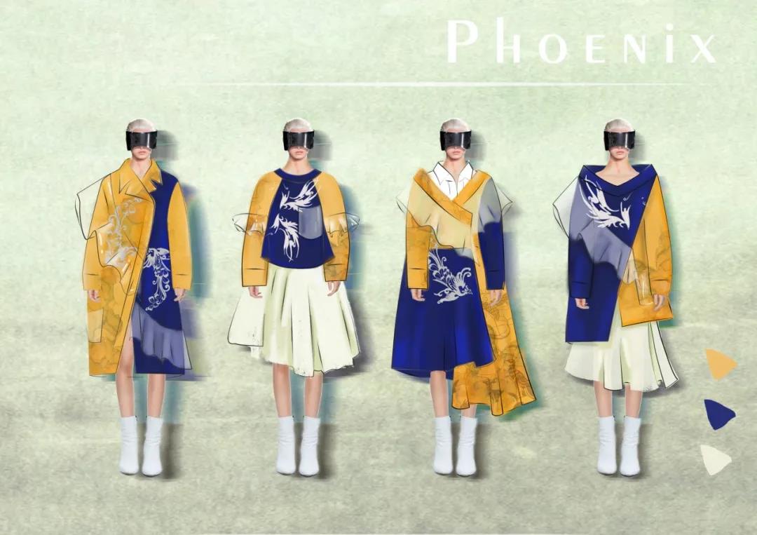 作品灵感来源于中国传统纹样中的凤凰图案,整体的款式造型以宽松休闲为主,采用宽大的服饰廓形,色彩上以对比撞色为主要表现形式,传统图案结合具有现代气息的面料、造型,凤纹与面料上的流云纹、鹿纹相辅相成,传递的是温柔坚定的女性力量和形象,并且带有吉祥美好的寓意,于庄重中呈现飘逸灵动的效果。