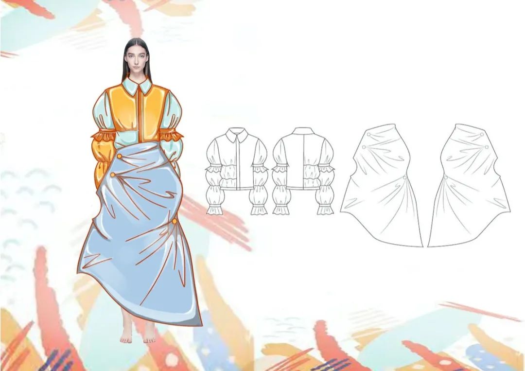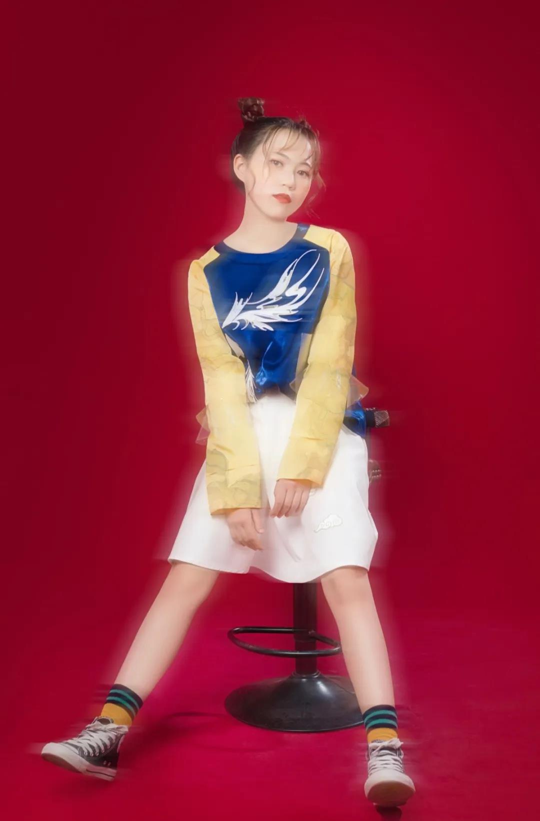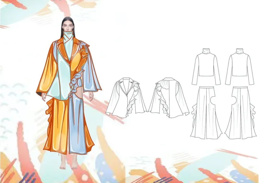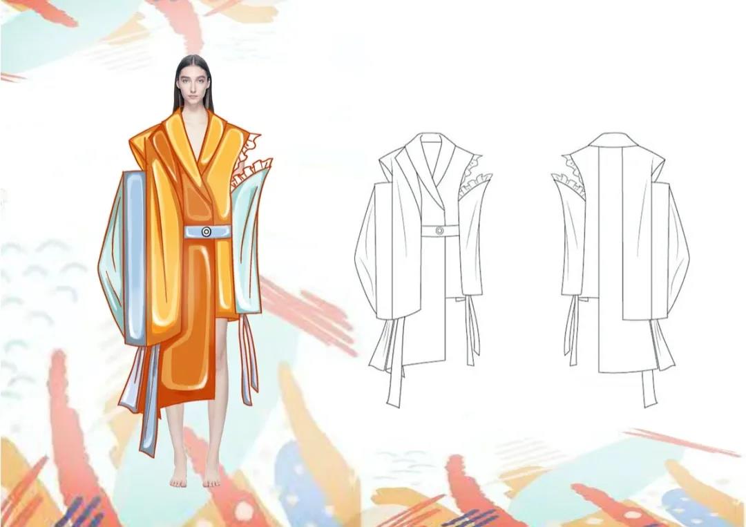 作品灵感来源于中国传统纹样中的凤凰图案,整体的款式造型以宽松休闲为主,采用宽大的服饰廓形,色彩上以对比撞色为主要表现形式,传统图案结合具有现代气息的面料、造型,凤纹与面料上的流云纹、鹿纹相辅相成,传递的是温柔坚定的女性力量和形象,并且带有吉祥美好的寓意,于庄重中呈现飘逸灵动的效果。