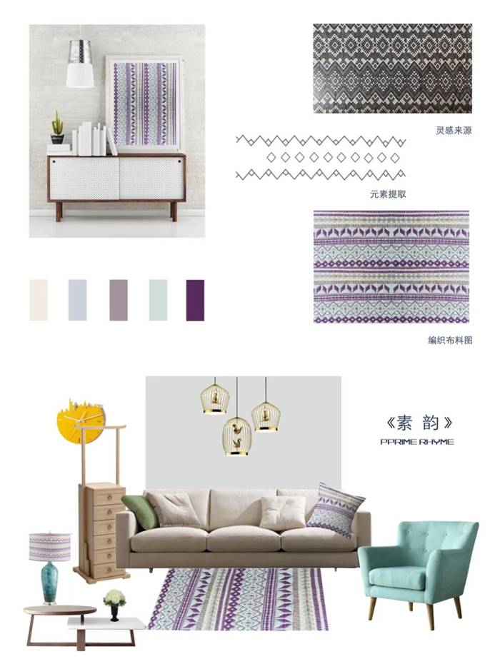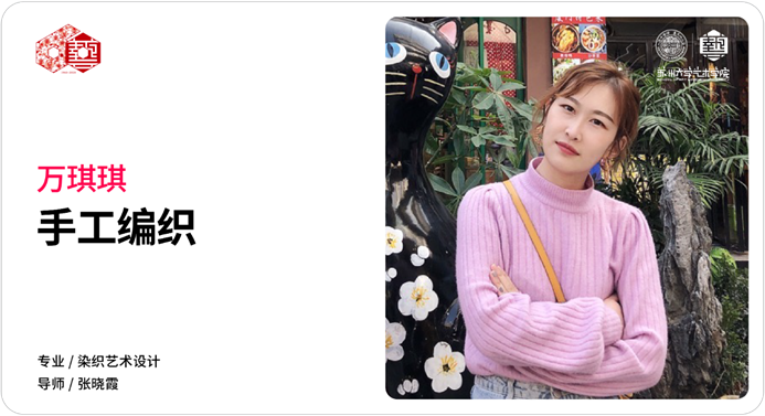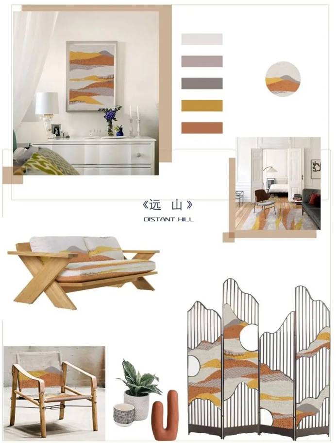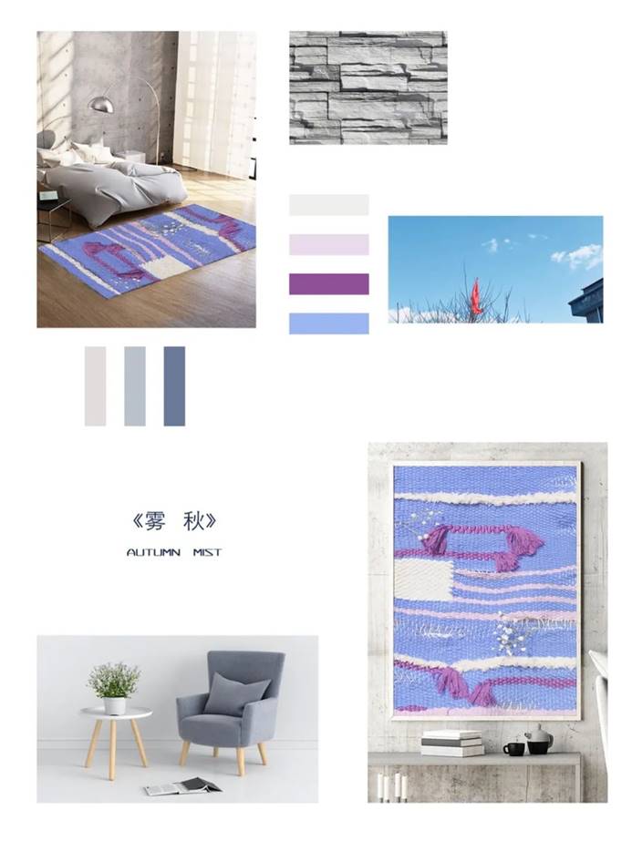 《蓝思》、《素韵》作品灵感来源于侗族素色被面,整齐的菱纹排列,配上莫兰迪色系,给人一种时尚的简约感。笔者对网络上的环境污染图片进行元素的归纳提取,《雾秋》选用象征“雾”的长方形,织物呈高冷的紫色调。《远山》以山峰为灵感来源,不同色系的黄,搭配粗线条质感的毛毡,层次更加丰富。