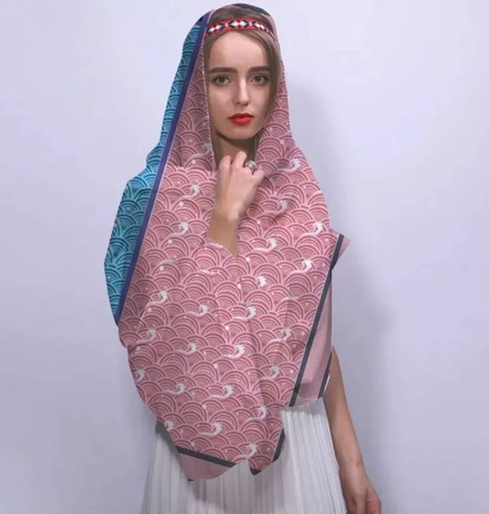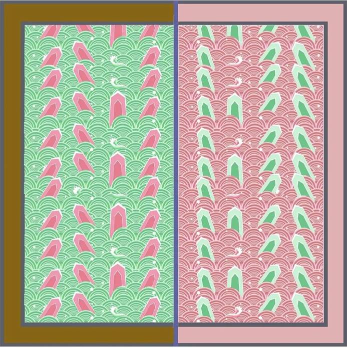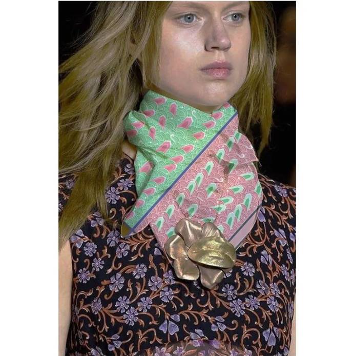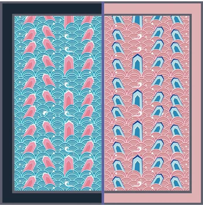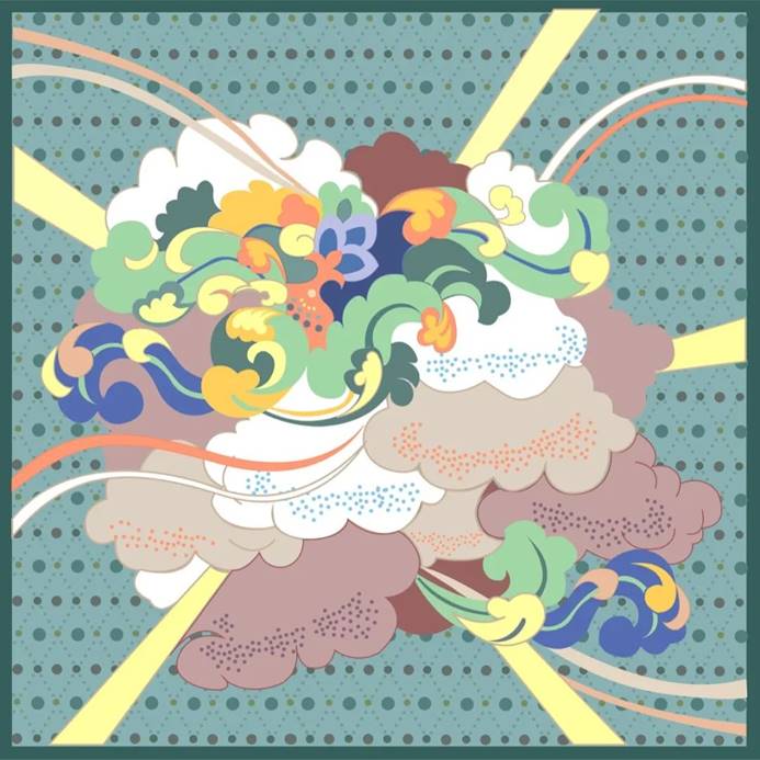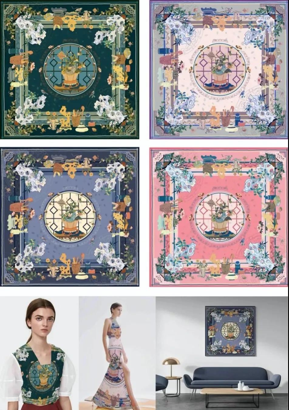取传统海水江崖纹中山崖与鳞状水波造型为设计灵感,重新组合,配以传统中国色,并以爱马仕丝巾通用骨架,复古的同时不失现代时尚感,适合年轻女性佩戴。