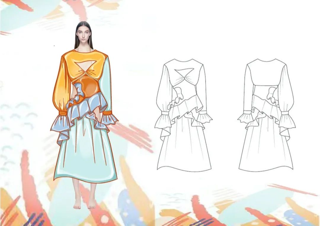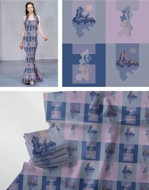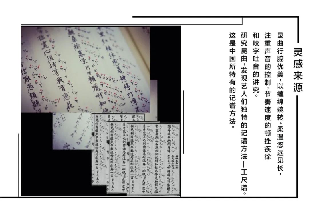 昆曲行腔优美,以缠绵婉转、柔漫悠远见长,注重声音的控制,节奏速度的顿挫疾徐和咬字吐音的讲究。昆曲中,艺人们独特的记谱方法——工尺谱。这是中国所特有的记谱方法。值得被挖掘以及被传承保护,发挥其作用。作品主要根据工尺谱的记谱方式,提取昆曲衣饰中的颜色,结合中国服饰的特点进行设计。在求新求异的同时也在保护和发扬传统文化,秉承创新的同时也注重设计的实用性理念。