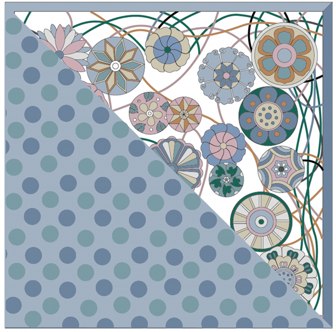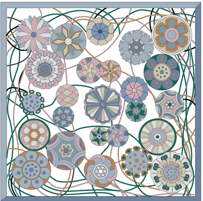 三三两两的小团花儿似有规则似无规则的组合在一起,散落在装饰物表面,宛如跳动的小皮球,谓之“皮球花”,是明清特有的装饰纹样。笔者以清代皮球花为原型,以家纺用品为载体,根据其组合特点,通过疏密、大小等不同排列方式,简单结合直线、曲线,探索传统纹样在现代设计中的传承与创新。