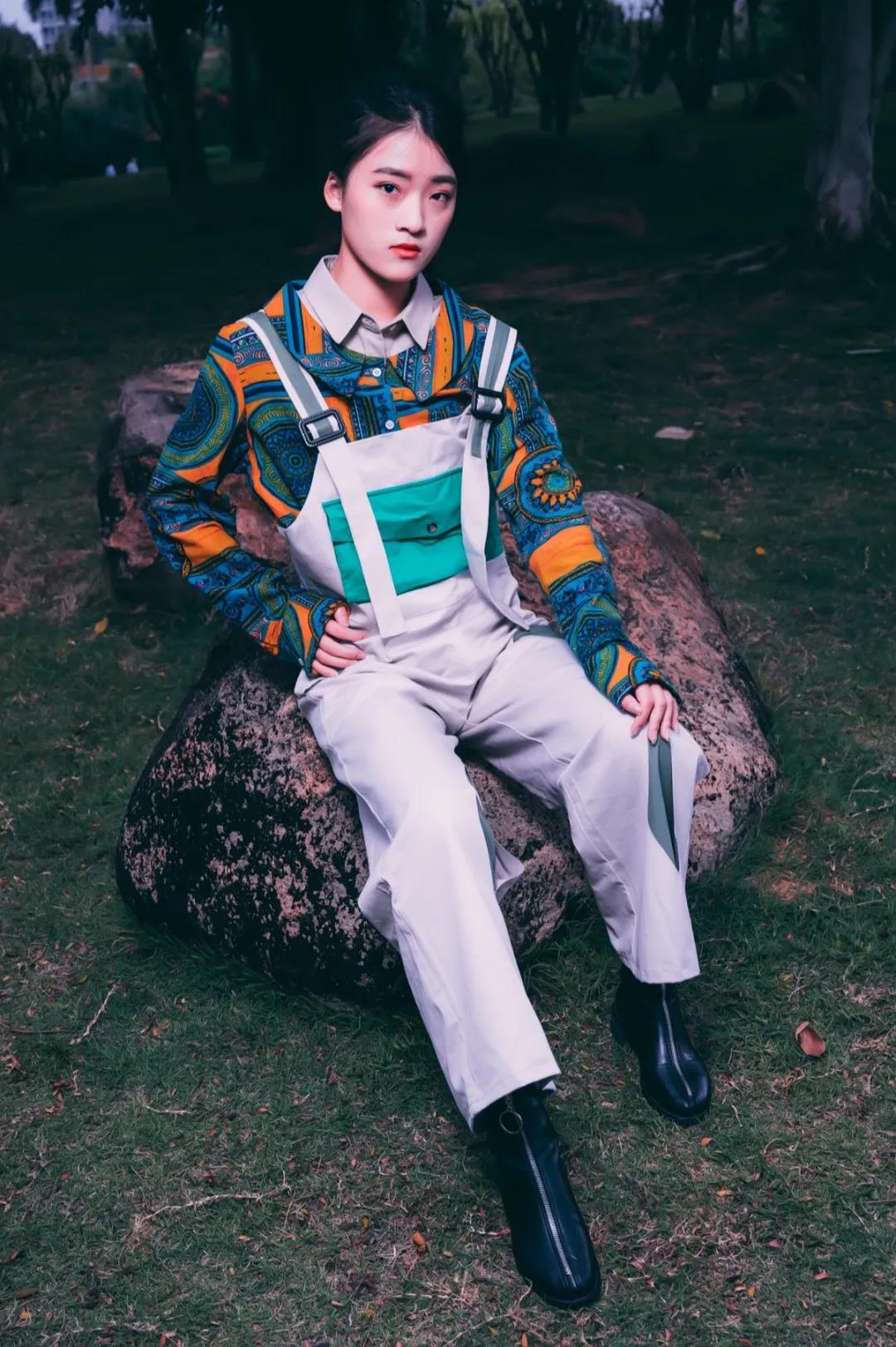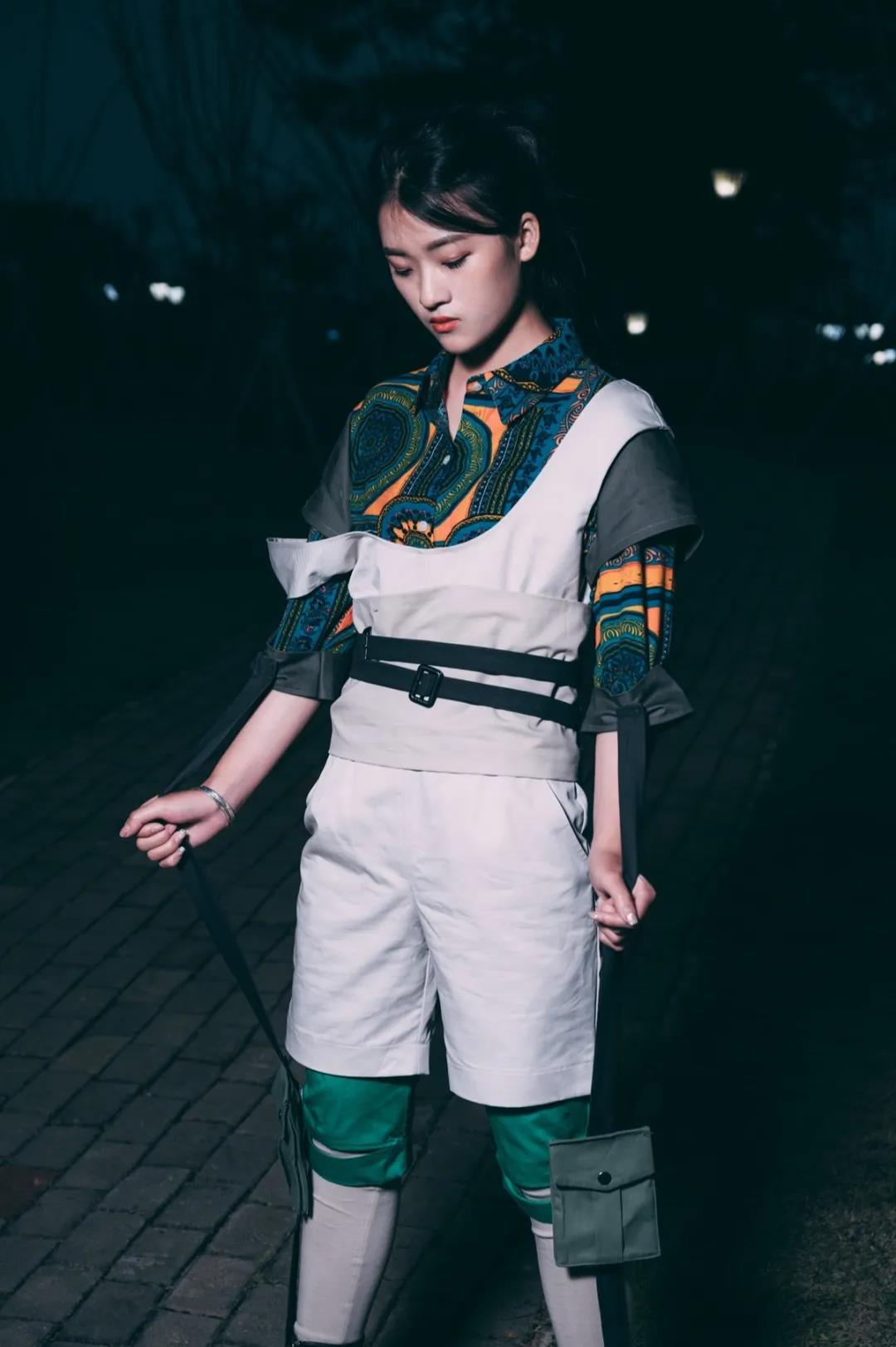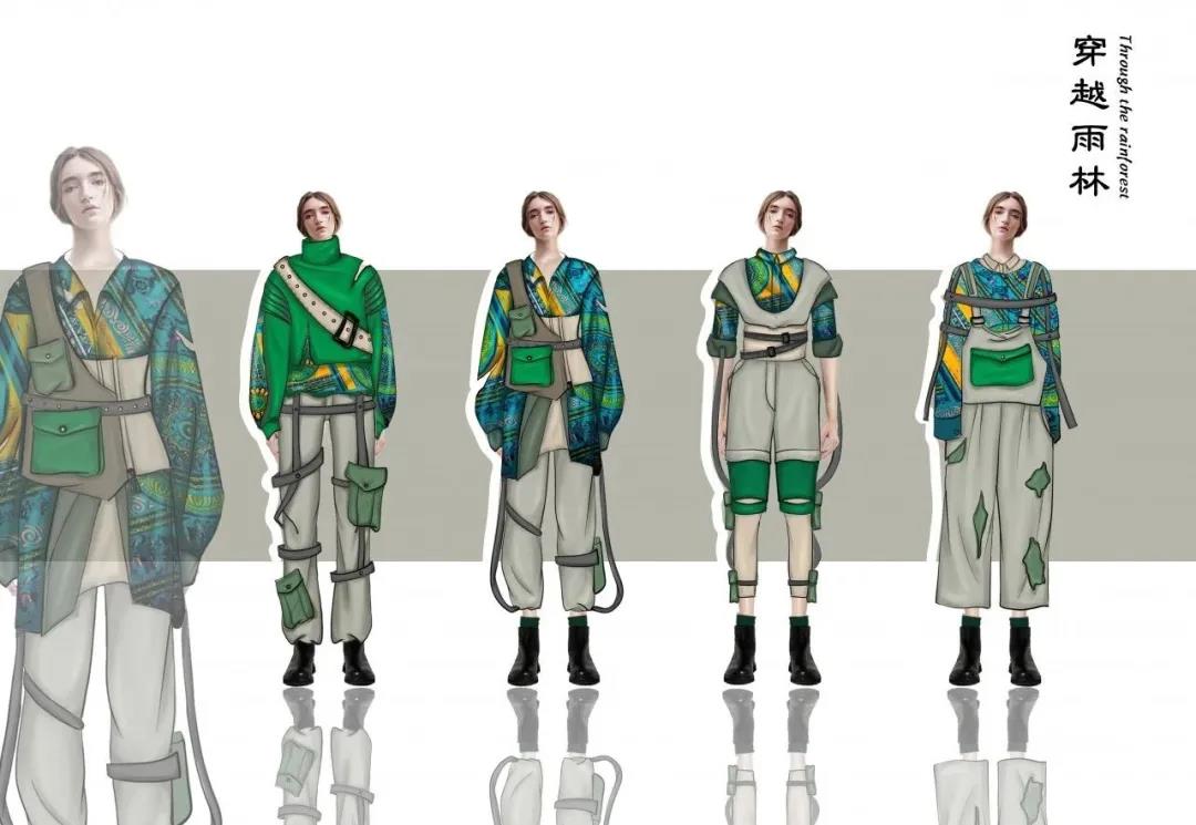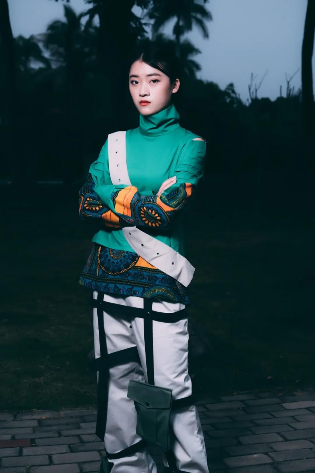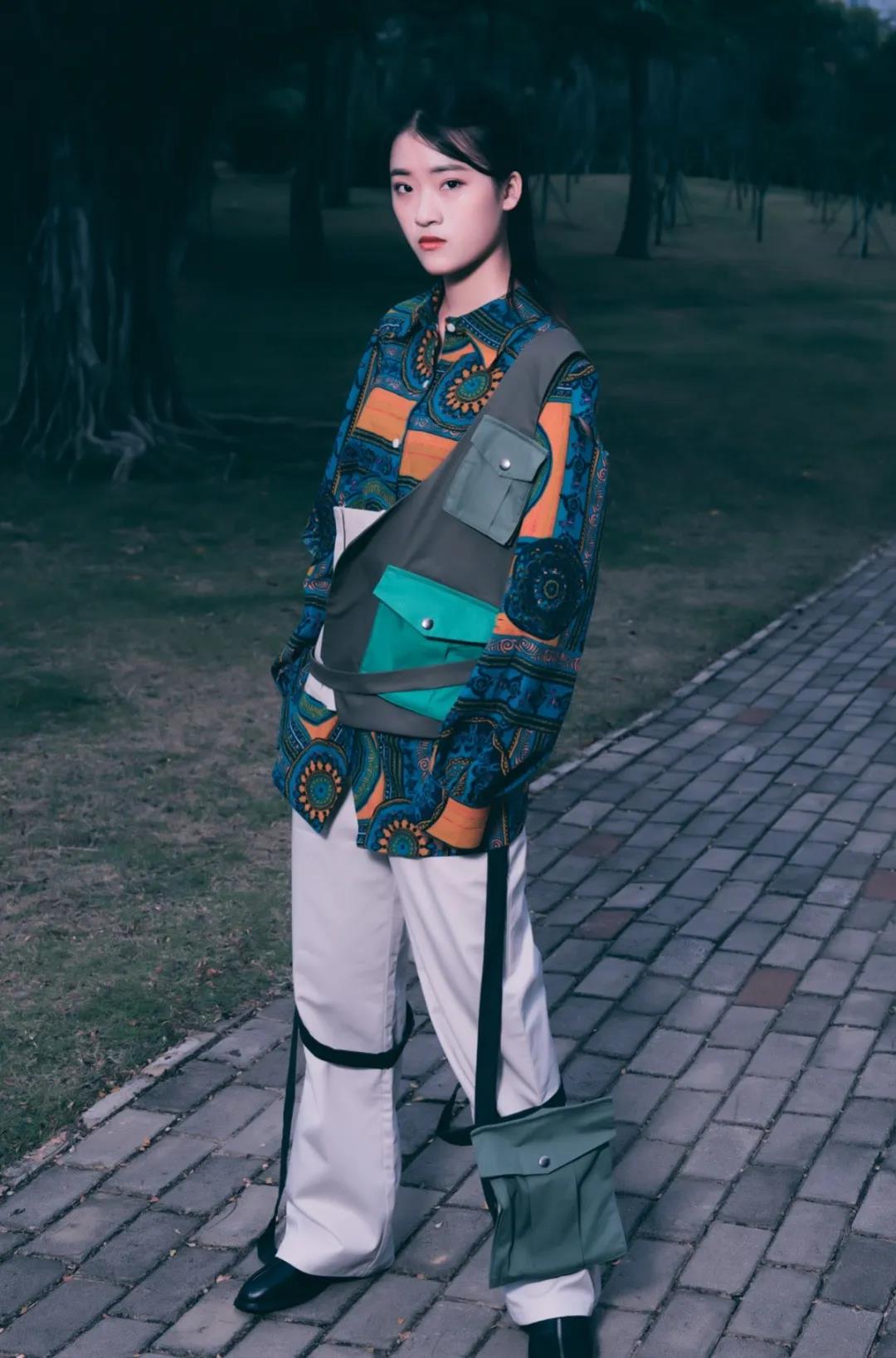 本系列作品设计来源于热带雨林元素,除了打破空间想象,还赋予时间穿越的理念,打造一种从过去穿行到未来旅行的感觉。很多都是不区分性别的搭配,是符合人体自由活动的,没有明确的种族、一种古着派,又具备未来主义式的精神面貌,可是另一面又极具平民主义的格调,杂糅、多元的气息是设计的主要想法。