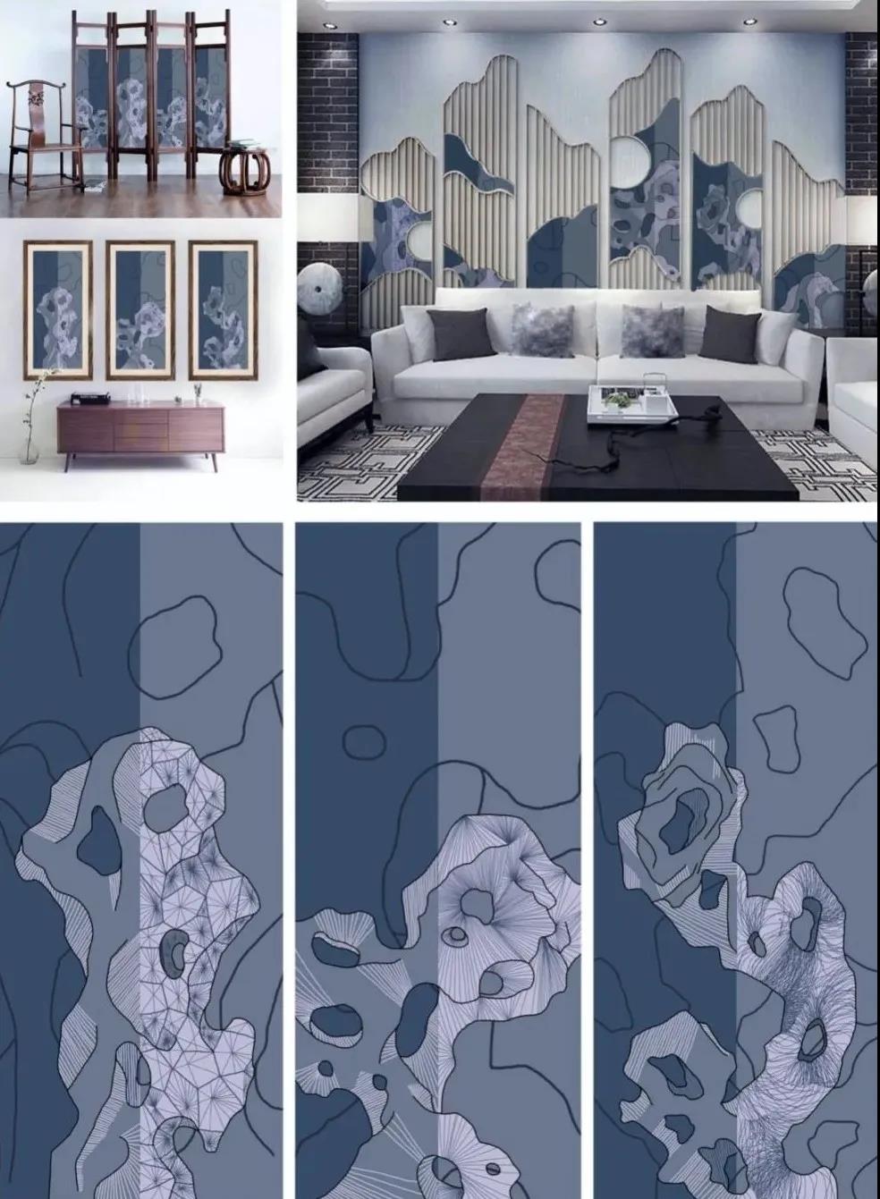 太湖石主题系列设计中的湖石图像尽数在中国古代纺织品的湖石纹样中撷英以及笔者的模拟绘制而成,将湖石形象遴选出来进行描摹绘制,再根据模拟湖石形象的经验创造新的湖石形象,是对古代湖石纹样的继承和创新。