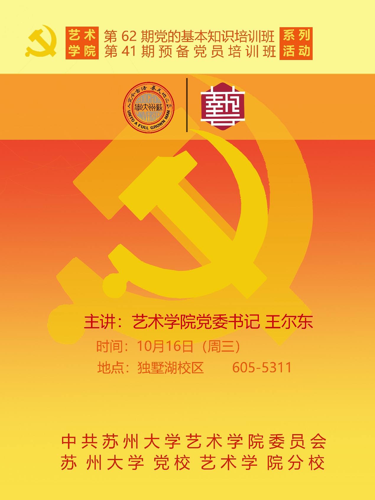 海报:艺术学院第62期党的基本知识培训班,第41期预备党员培训班系列活动——主讲:艺术学院党委书记 王尔东