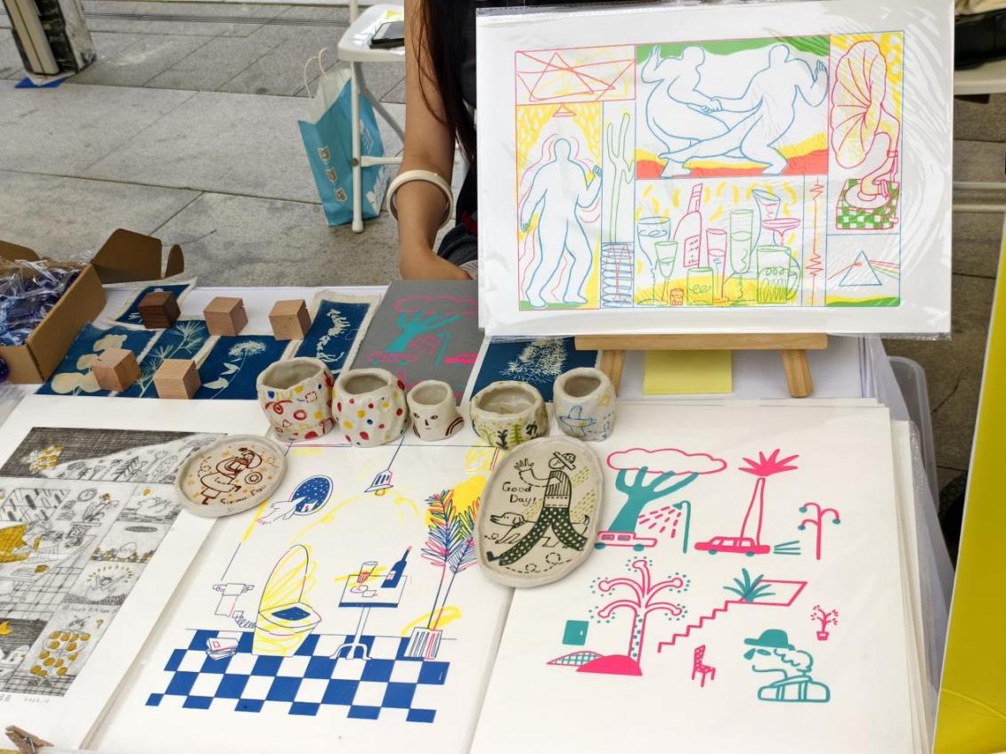 “苏大插画”将传统技艺与现代创意相融合,赋予其新鲜的生命力。现场有志怪博物倾向的作品,是参考的水滴鱼(软隐棘杜父鱼)的造型并且结合日本神话中的海坊主设计的一套极具艺术风格的手办雕塑作品。《没有意义就没有摇摆》系列丝网版画以明快的色彩、流畅的线条,传递出一种自由随性的生活态度。"蓝晒自然"系列以古典蓝晒工艺为媒介,通过阳光与植物的直接对话,在纸面上留下最原始的生态印记。