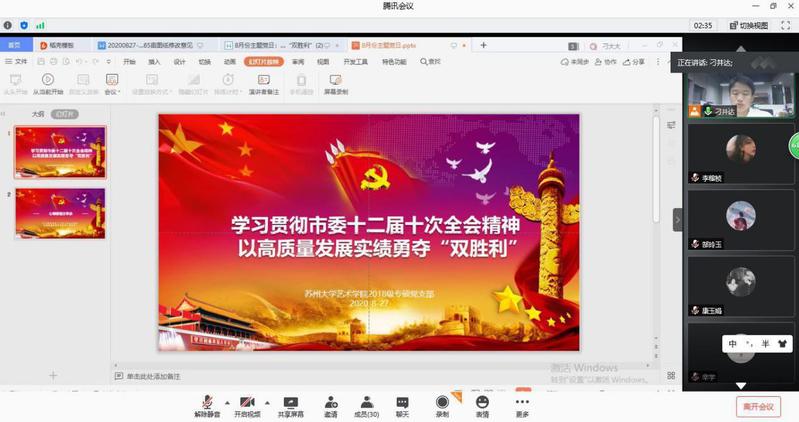 8 月 27 日晚 8 点,艺术学院 18 专硕党支部在网上召开了本次集中学习会议。内容就习近平总书记的新观点新言论的感悟、相关文件的学习感悟、现在的就业形势以及自身应该怎么做等问题进行多方面讨论。