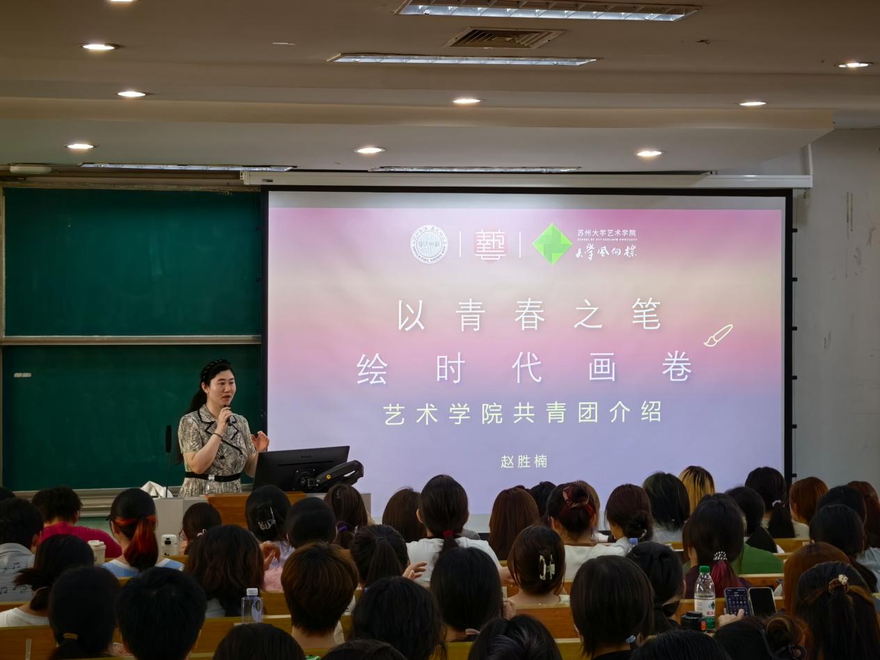 在共青团相关知识介绍环节,赵胜楠老师分别从“什么是大学里的共青团”、“艺术学院的团工作有什么不一样”、“你如何成为这个精彩舞台的主角”三个方面展开介绍。