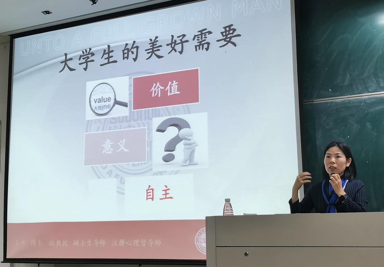 王平系我校心理健康中心的常驻导师,她以“新时代重要新特点”为切入点,引出当代大学生的三点美好需要:“价值”、“意义”与“自主”。
