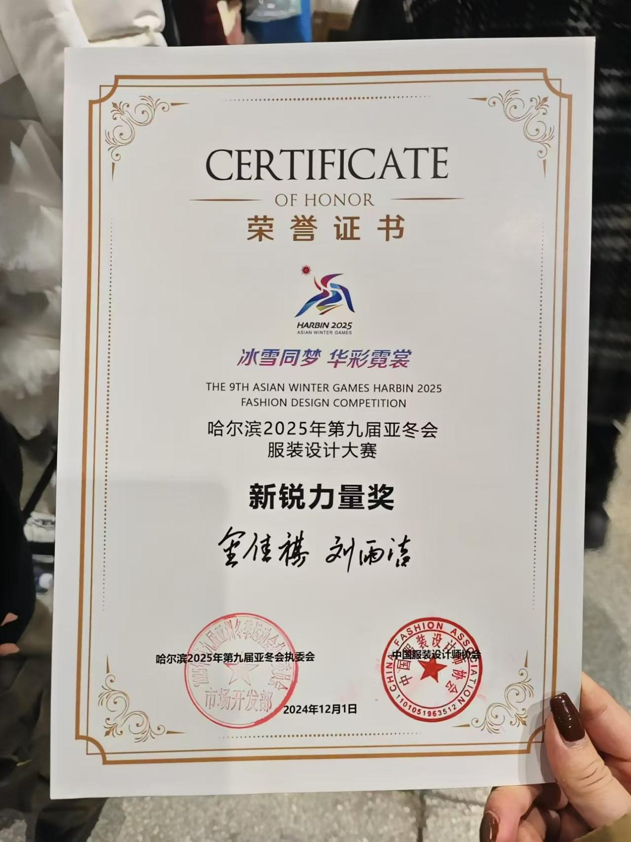 近日,哈尔滨第九届亚冬会服装设计大赛组委会公布了比赛结果。我院金佳祺老师荣获新锐力量奖。