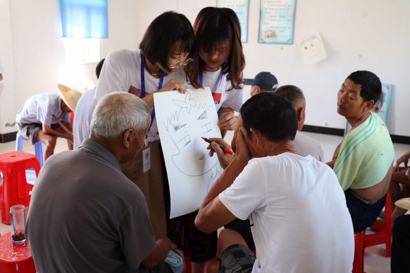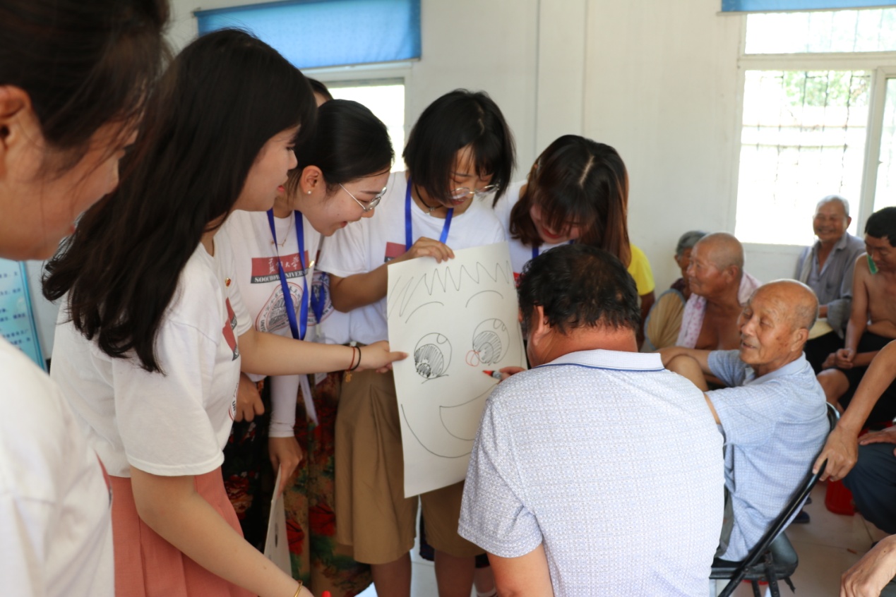 最后进行了游戏,闭眼画鼻子,志愿者们为老人们准备了许多没有鼻子的人像,由于害怕出错,老人们小心翼翼不敢尝试,在志愿者们的鼓励下,他们勇敢的拿起画笔,参与到游戏中来,整个汇演在欢声笑语中结束。
