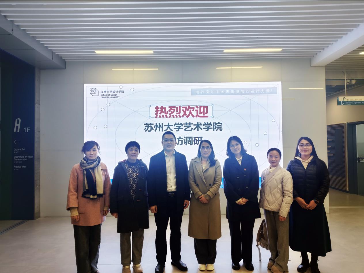 为深化兄弟院校交流合作,汲取党建与学工先进经验,2025年11月20日下午,苏州大学艺术学院党委书记徐美华、党委副书记兼副院长虞岚,党支部书记、专职辅导员、专职组织员等一行赴江南大学设计学院围绕党建“双创”工作、党建引领高质量发展及学工品牌建设等议题展开调研。江南大学设计学院党委书记王维青、党委副书记兼副院长江琳娜、产品设计系党支部书记董玉姝、分团委书记兼学工办主任吴雨琛等参加调研座谈。