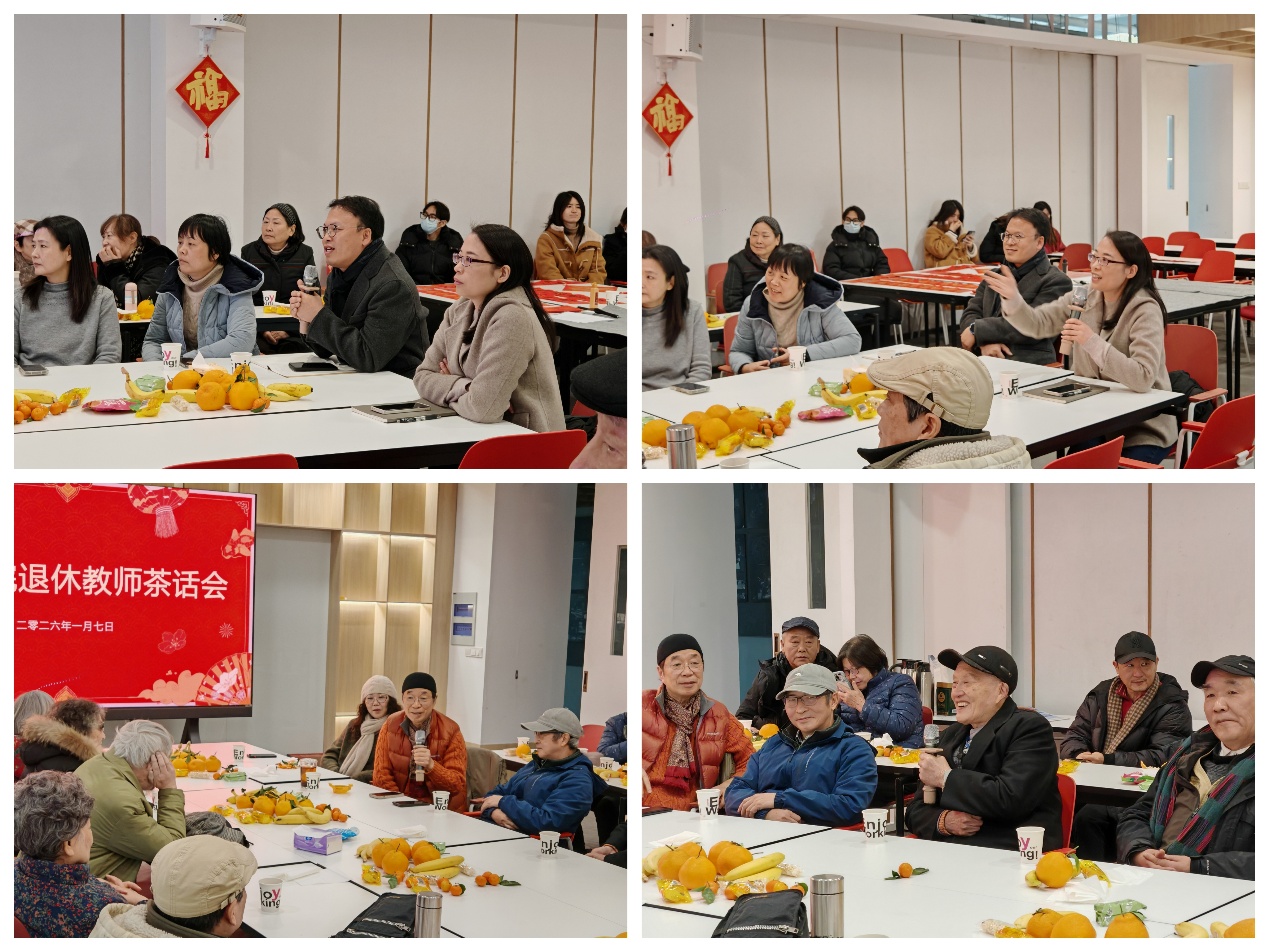 茶话会现场暖意融融,欢声笑语不断。徐美华首先代表学院向全体退休教师致以诚挚问候、感谢他们为学院事业发展奠定的坚实基础与长期奉献、并祝愿大家新春快乐、持续关注并支持学院建设。王珂汇报学院2025年在团队建设、学科创新、科研突破、人才培养与社会服务等方面取得的新进展,并展望2026年学院重点规划。退协负责人张天星教授深情回顾了与学院共同成长的岁月,感谢学院对退休教师的持续关爱,表示将继续发挥余热,为学院高质量发展贡献力量。朱春华老师代表退休教师,对学院取得的成绩给予高度评价,对学院未来的发展充满信心。