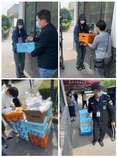 慰问中,学院领导、老师为大家送来了防护物资以及水果礼盒,切实解决了同学们采买的困难,并与同学们进行亲切交谈,关心询问他们在校的学习、生活、身体情况,是否有学习和生活上的困难。顾书记提到当前疫情防控形势依然严峻复杂,疫情防控,人人有责,必须严格遵守学校疫情防控工作要求,做好科学防护,继续配合好校园疫情防疫工作,要树立攻坚克难的信心,保持积极乐观的心态,身体力行维护校园安全稳定和疫情防控工作。张书记叮嘱同学们要利用这段“特殊”时期,多读书,多充电,遇到困难及时与辅导员老师沟通,合理规划时间,加强体质锻炼,以阳光的心态投入学习生活。