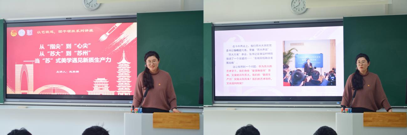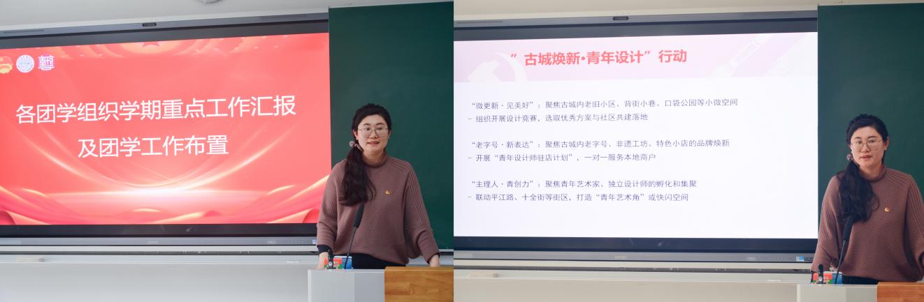 随后,由团委书记赵胜楠带来主题微团课——《从指尖到心尖,从苏大到苏州,当苏轼美学遇见新质生产力》。赵老师结合全国两会精神,以新质生产力推动高质量发展为时代背景,立足苏州深厚的历史文化底蕴与苏州大学百年办学积淀,引导在场学生骨干将中华优秀传统美学与现代创新实践相结合,将个人专业所长与地方发展需求相契合。接着,各学生组织围绕本学期重点工作、品牌活动、特色项目、创新举措与预期目标进行汇报。