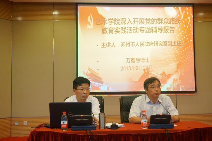 9月27日19:00,艺术学院在炳麟图书馆学术报告厅举行党的群众路线教育实践活动专家辅导报告会暨艺术学院第五十期党的基础知识培训班、第二十九期预备党员培训班开学典礼。本次报告会由苏州市人民政府研究室副主任、法学博士万智慧同志担任主讲嘉宾,艺术学院全体教师党员、学生党员听取了报告。报告会由艺术学院党委书记宁正法主持。