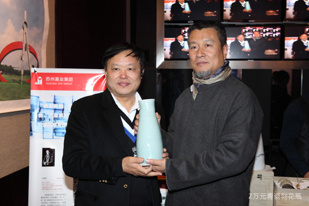 这次他得知苏州基业要举办一场爱心义卖活动时,专程两次去景德镇下作坊进行创作,精心准备,塑造器皿。那精致细腻的一笔一画,将古朴的韵味与现代审美有机结合。义卖现场的高潮,莫过于沈老师的一件青瓷刻花瓶以20000元的价格,被华商书院苏州校友会会长常利红先生以华商书院苏州校友会的名义买下了!这件作品是青瓷刻花,粗犷中不乏细致,瓶颈与瓶身均加入自由写意纹理的效果。它不同于以西方陶艺表现的直露,这种肌理效果处理得如此含蓄内敛具有东方特色,在用手触摸的时候,它的表面细腻中呈现光滑,肌理的质感柔和而不显突兀。