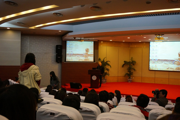 张晓涛副教授的讲座首先介绍了第55届威尼斯双年展的主题——“百科全书的宫殿”,以及其策展人马西米利亚•吉尼奥。接着较为详细的介绍了此次双年展分为两个部分,一是主题展,由花园馆和军械库组成;二是国家馆,实质上是文化、艺术、科技与网络的全方位较量,在当今全球化的时代是一个看不见硝烟的战场。接着又结合ppt与学生们分享了双年展中有趣而又独特的作品图片,并让学生们学习欣赏了他的两个动画作品《量量历险记》和《萨迦》。