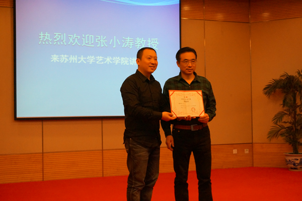 本次讲座开始前,张小涛副教授将其作品全集捐赠给艺术学院,宁正法书记代表学院接受了捐赠并表示感谢。