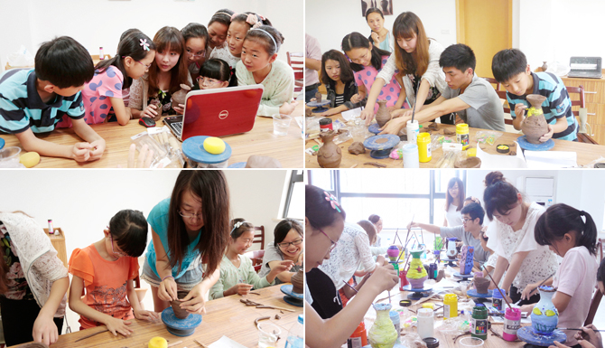 队员们先教孩子们压好底的模板——压出一个完整而平滑的圆形。在制作过程中,当遇上各种情况,队员们都细心地辅导孩子们,告诉他们需要做出哪些调整。帮助孩子们在增强动手能力的过程中,也加强对事物的思考分析能力。队员们一边为孩子们授课,一边与孩子们进行有趣的交谈,给孩子们留下了阳光风趣的大哥哥大姐姐的良好印象,活动现场充满了轻松愉快的气氛,欢声笑语连连不断。待孩子们制作的花瓶的基本形大致完成,孩子们纷纷挑选了自己喜欢的颜色为陶泥花瓶上色,陶泥花瓶一下子变得色彩缤纷,让人无不感到属于小孩子特有的天真烂漫和清澈无暇。之后,孩子们还纷纷为自己的作品取了名字,有叫“七彩花瓶”的、有叫“奥特曼瓶”的,等等,都充满了天真与童趣。作品完成后,队员们将孩子们的作品一一陈列在工作台上进行展示,并邀请孩子们的家长进行参观。大家对孩子们的作品称赞不绝,孩子们也十分开心,现场气氛其乐融融。