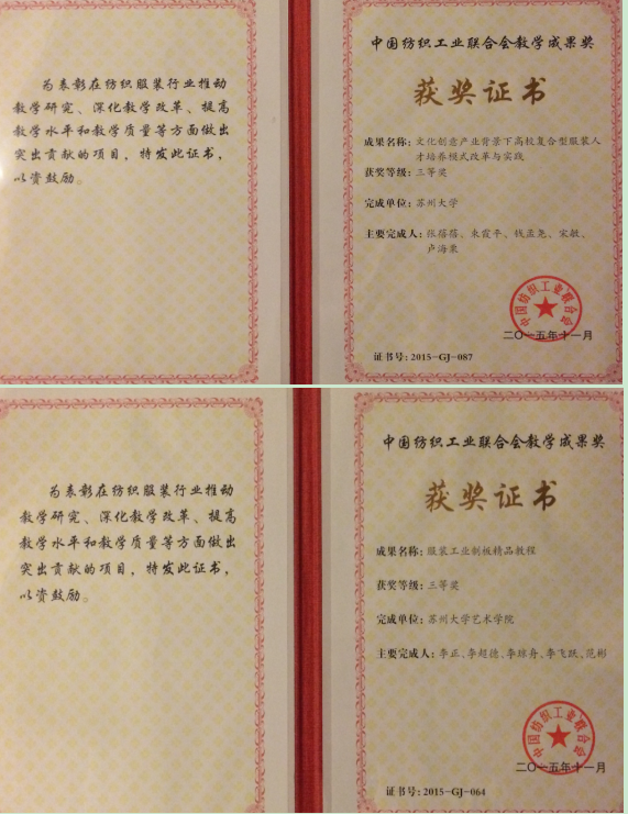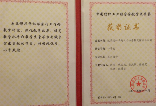 我院教师许星、钱孟尧、黄燕敏、张晓霞、张茵、张蓓蓓的“服装设计卓越人才培养模式探索与创新”获得了教学成果一等奖;李正、李超德、李琼舟、李飞跃、范彬的“服装工业制版精品教程”获得了教学成果三等奖;张蓓蓓、束霞平、钱孟尧、宋敏、卢海栗的“文化创意产业背景下高校复合型服装人才培养模式改革与实践”获得了教学成果三等奖;李正老师获得教师奖;服装艺术设计专业胡小燕(研究生)、李艳超(本科)、染织艺术设计专业郑佳慧(研究生)、杨桂英(本科)、时装表演与服装设计专业刘泽汐(本科)获得学生奖。
