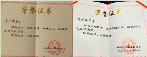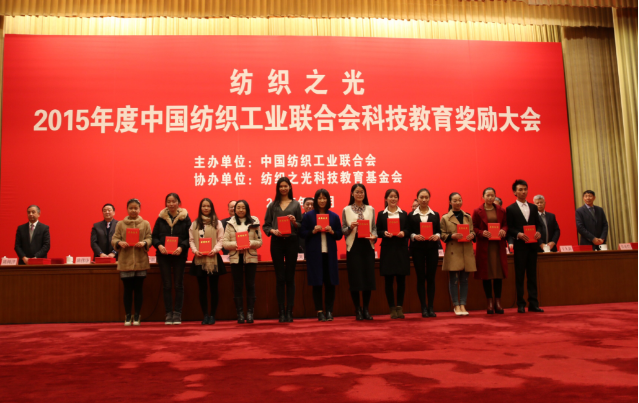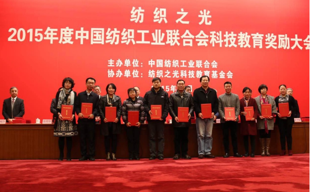 11月24日,由中国纺织工业联合会主办,纺织之光科技教育基金会协办的“纺织之光2015年度中国纺织工业联合会科技教育奖励大会”在人民大会堂召开。中国纺织工业联合会会长王天凯,原会长杜钰洲,副会长兼秘书长、纺织之光科技教育基金会理事长高勇,副会长孙瑞哲、杨纪朝,副会长、纺织之光科技教育基金会副理事长夏令敏,党委副书记陈伟康,纪委书记、人事部主任王久新,顾问陈树津、张延恺等领导出席大会并为获奖代表颁奖。大会分别颁发成果奖、教育教学成果奖、教师奖、学生奖、针织内衣创新奖等奖项并授予全国纺织行业技术能手荣誉称号。