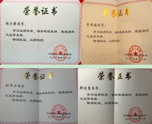 纺织之光2015年度中国纺织工业联合会纺织教育教学成果共授奖164项,其中一等奖18项,二等奖39项,三等奖107项;纺织之光教师特别奖1人,教师奖21人,学生特别奖2人,学生奖147人,今年的获奖项目主要集中在人才培养模式探索与实践、课程体系建设、教学方法与模式改革、学生能力培养、实践性教学等方面。