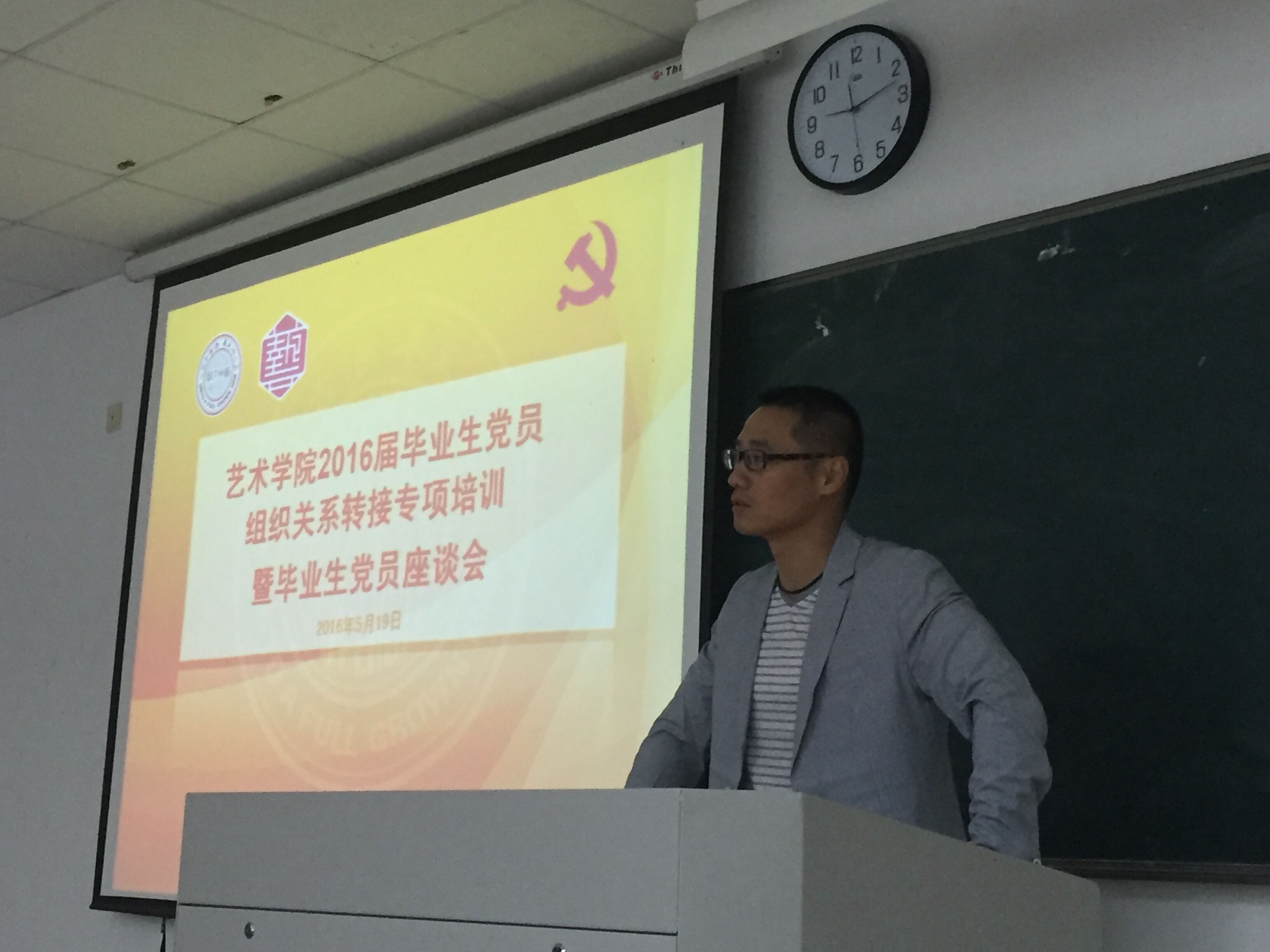 5月19日上午,艺术学院在606教学楼6110教室召开2016届毕业生党员组织关系转接培训暨毕业生党员座谈会,培训和座谈对象为2016届即将毕业的学生党员。学院党委副书记、副院长程晓军,研究生教学秘书李旸,学院学生工作办公室和团委卢海栗老师、沈院生老师一并参加了会议。会议由学院学生工作办公室主任虞岚老师主持。