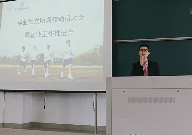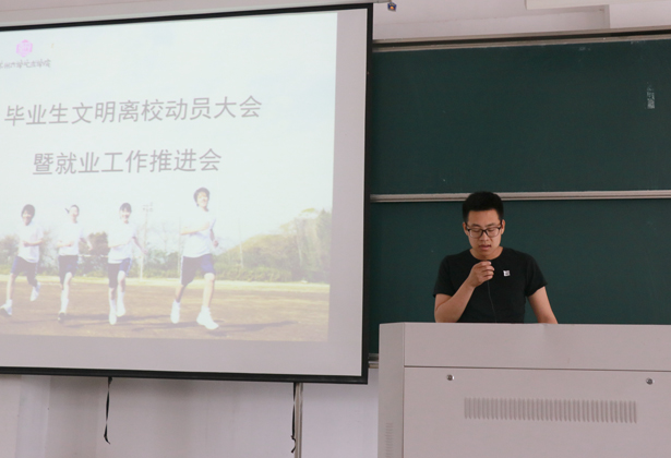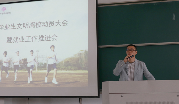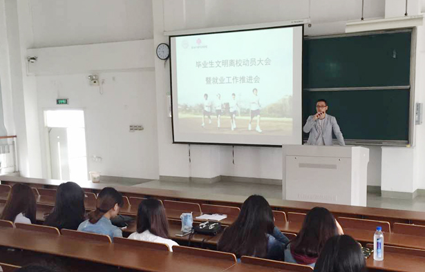 会议伊始,卢海栗老师主要说明了就业工作的相关事宜和离校工作的日程安排。卢老师提到就业率是学校办学质量的重要指标,鼓励毕业生们积极投入到就业工作中去,提高我院就业率;同时要求同学们心怀感恩,做到文明安全离校。