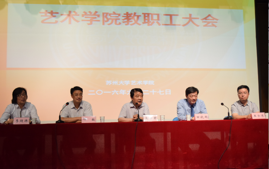 6月27日下午,艺术学院教职工大会在601号楼音乐厅举行。出席会议的有校党委书记王卓君,副校长、艺术学院原院长田晓明,党委组织部部长邓敏,艺术学院原党委书记李超德、艺术学院党委书记王尔东。参加会议的还有党委组织部副部长周玉玲、党代表联络办主任李全义、党委组织部部长助理朱尧兴、干部科科长于潜驰,艺术学院全体教职工,会议由邓敏主持。