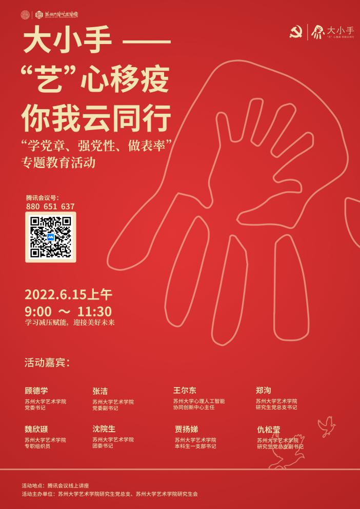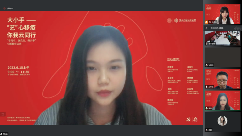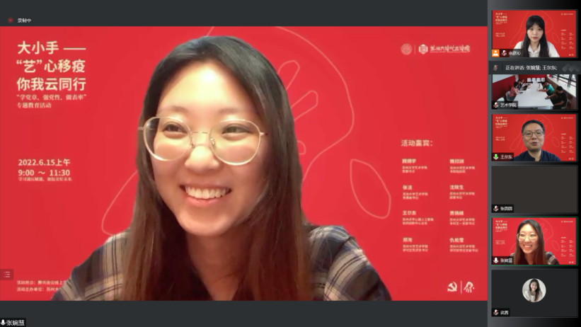 2022年6月15日上午9:00,艺术学院研究生党总支和研究生会联合举办了“大小手——‘艺’心移疫,你我云同行”——“学党章、强党性、做表率”专题教育活动。