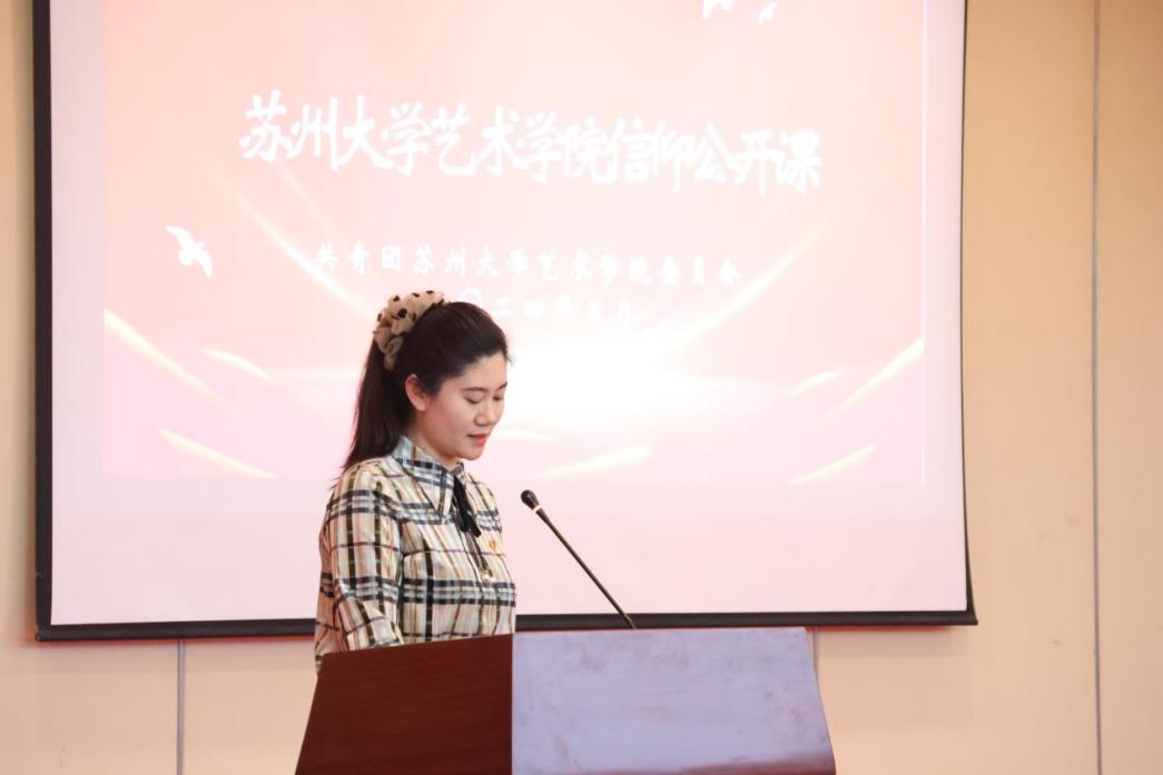 5月15日下午,“苏州大学艺术学院信仰公开课”在炳麟图书馆报告厅举行。艺术学院党委书记宁正法,党委副书记、副院长张洁,研究生辅导员仇松莹,学院专业教师,院级青马工程学员、全体学生骨干、各班团支书及班委等参加活动。活动由学院团委负责人赵胜楠主持。