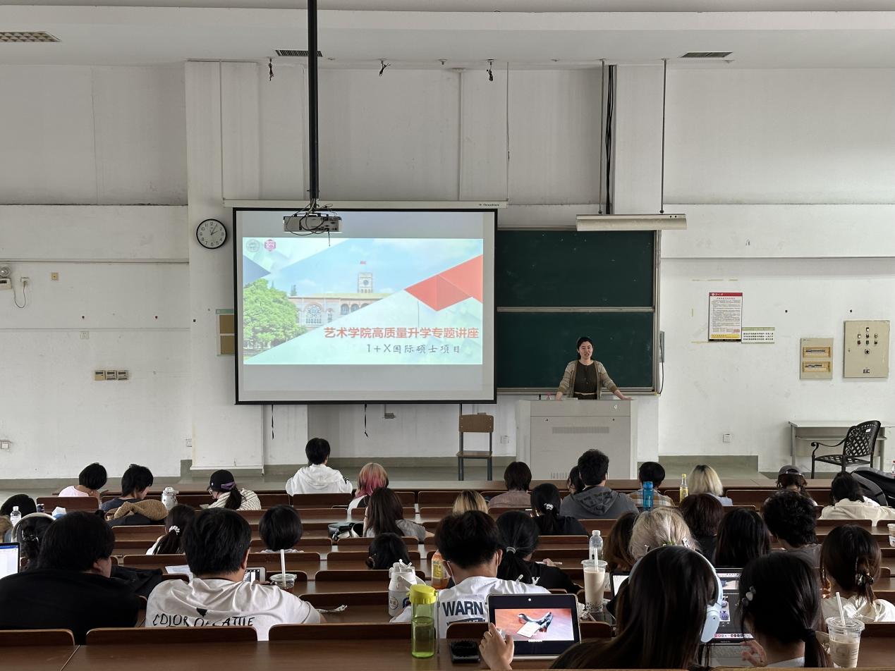 为深入实施“铸魂逐梦”工程,助力大学生高质量升学发展,帮助学生拓宽国际视野、规划专业发展。5月22日下午,我院特邀继续教育学院留学中心升学指导老师邓淑琴面向2021级全体同学开展艺术学院高质量升学专题讲座。讲座由浅入深地介绍了“1+X国际硕士项目”,不仅针对艺院硕士阶段的可选项目进行了细致讲解,还针对升学方向及其它具体问题提供了对点指导。本次讲座由2021级辅导员赵胜楠主持。