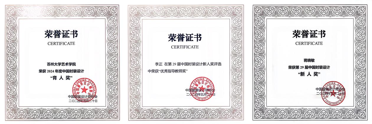 2024年5月20日,由中国服装设计师协会主办的第29届中国时装设计“新人奖”评选圆满结束。我院22级学硕服装与服饰设计专业蒋晓敏同学荣获第29届中国时装设计新人奖,李正教授荣获2024年度中国时装设计优秀指导教师奖,苏州大学艺术学院荣获2024年度中国时装设计育人奖。