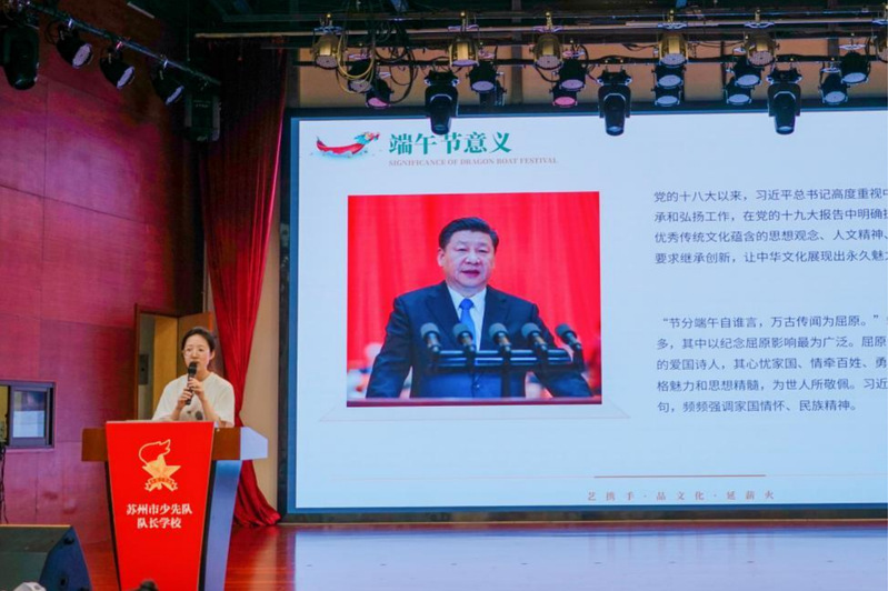 活动伊始,苏州大学艺术学院研究生专硕第一党支部副书记潘琪星为青少年们呈现了一节生动的文化传播微课堂,深入浅出地介绍了端午节的文化内涵,带领大家追溯端午起源、重温屈原诗篇,深刻感悟传统节日背后的人文底蕴,激发青少年们的爱国主义情怀。