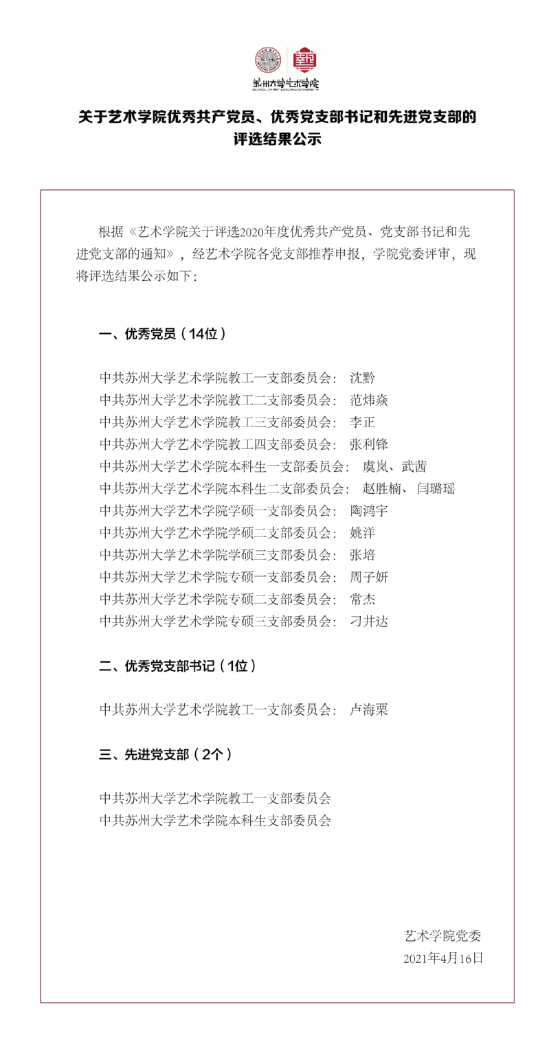 关于艺术学院优秀共产党员、优秀党支部书记和先进党支部的评选结果公示