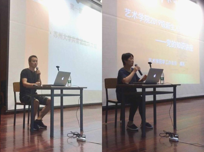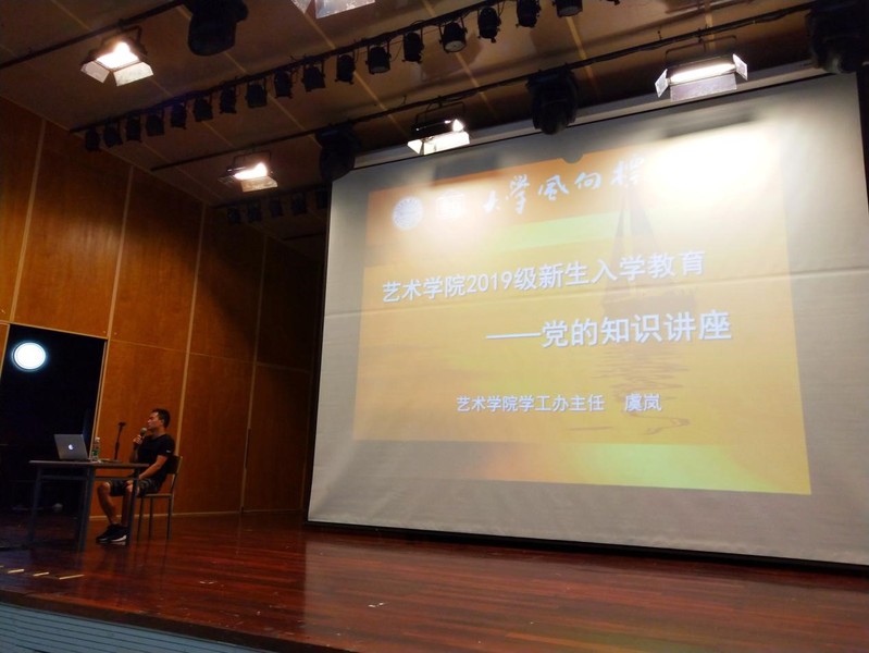 2018年9月14日上午11点30分,艺术学院在601音乐厅召开党团知识讲座,讲座由学生办公室主任、团委书记虞岚和团委书记沈院生老师共同主持。