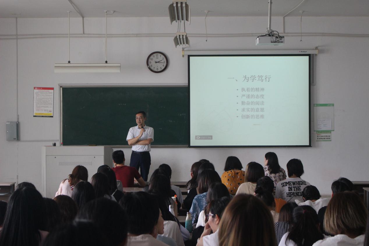 9月13日下午,博士生导师江牧老师围绕着“学以致用,学以致人”进行了演讲,并提出了在研究生生活重其实学的是“为学笃行”和“做人诚信”。江牧老师提出新生们应通过勤奋阅读,以严谨求实的态度和创新的思维去学习,让新生清楚的认识到研究生学习生活应有的状态,以及大学毕业生所面临的种种社会问题。