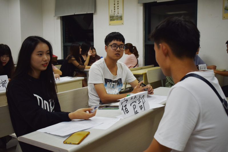首先新生们在候场区等待面试,随后在工作人员的带领下前往各教室面试。面试地点根据学生组织而定,团委办公室、新闻中心在6103面试;团校、科协在6110;学生会在6120;青协、心协在6107;社联、学生事务委员会在6108。各个组织的面试都在有条不紊地进行着。
