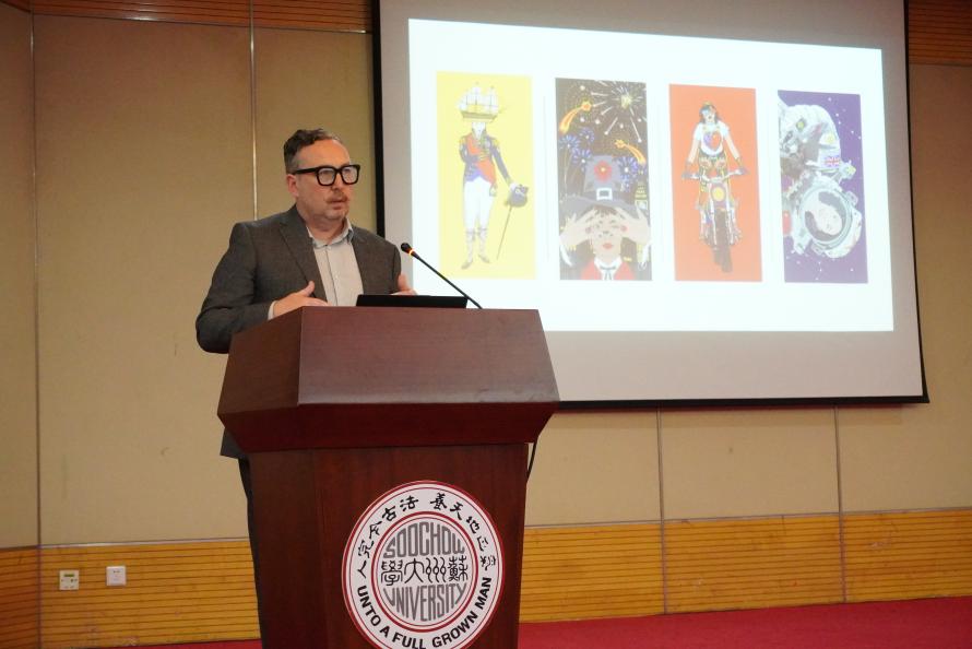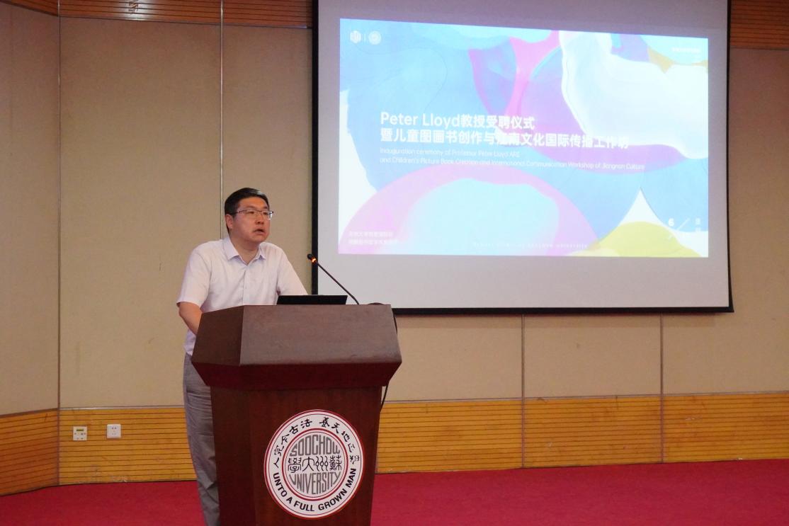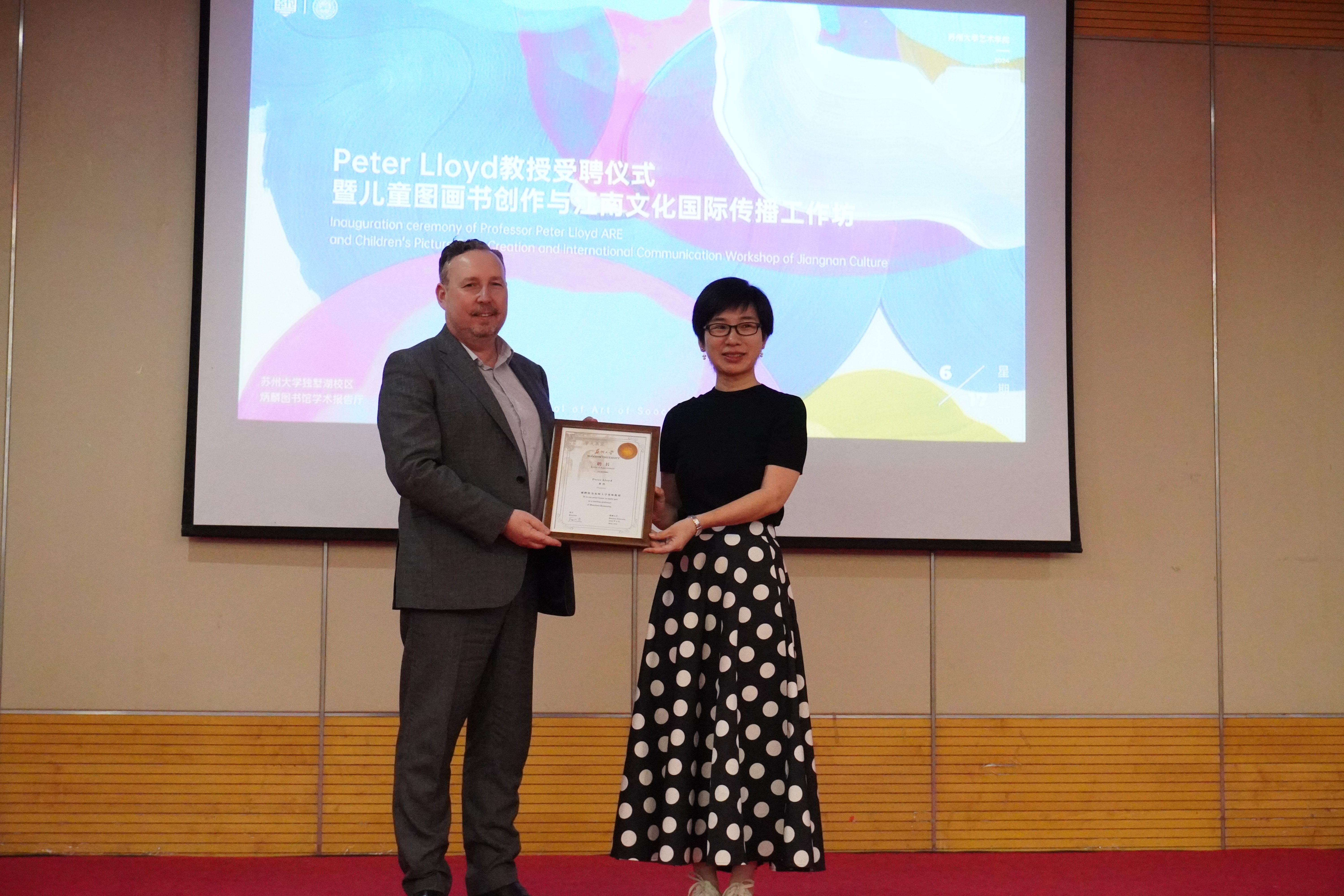 2024年6月17日下午两点,Peter Lloyd教授的受聘仪式暨儿童图画书创作与江南文化国际传播工作坊活动在苏大炳麟图书馆的报告大厅内顺利举行。本次活动邀请到了英国中央兰开夏大学艺术与传媒学院院长Peter Lloyd教授,与苏州大学客座教授、江南文化国际传播研究中心主任、知名插画家郁蓉女士共同分享他们的见解与经验。出席本次活动的还有苏州大学人文社会科学处处长陈一、苏州大学国际合作交流处副处长资虹、苏州大学人才工作办公室人才培育办主任杨浩、苏州大学艺术学院院长王柯、江苏凤凰少年儿童出版社编辑秦潇、江苏凤凰少年儿童出版社编辑刘天遥、中央兰开夏大学亚洲合作办公室国际招生官、苏州大学艺术学院院长助理张欣、苏州大学艺术学院美术系插画方向讲师吴莹莹。活动由院长王柯主持。