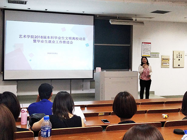 为深入做好毕业生就业工作和文明离校工作,苏州大学艺术学院于5月25日下午3:30在605幢-5201教室召开了2018届本科毕业生文明离校动员暨毕业生就业工作推进会。2018届毕业生集体参加了大会。艺术学院党委副书记、副院长张洁老师出席了会议。大会由2014级辅导员虞岚老师主持。