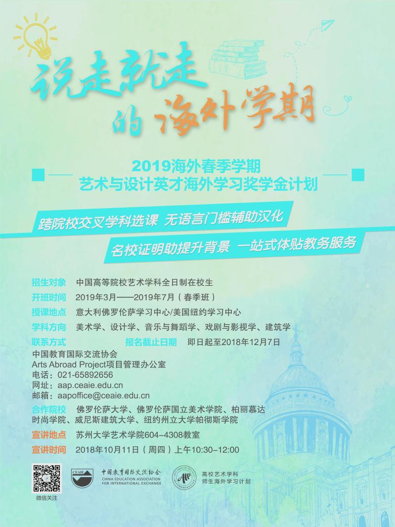 附件1:2019春季佛罗伦萨学习中心课程大纲.xlsx附件2:2019春季纽约学习中心课程大纲.xlsx附件3:《艺术与设计英才海外学习奖学金计划报名细则》.doc附件4:《 2019春季海外学期申请表》.doc高校艺术学科学生海外学习计划2019年春季学期报名通知.docx关于开展2019春季交流项目及奖学金生选拔的通知.pdf关于开展2019春季师资访学进修资助项目的通知.pdf