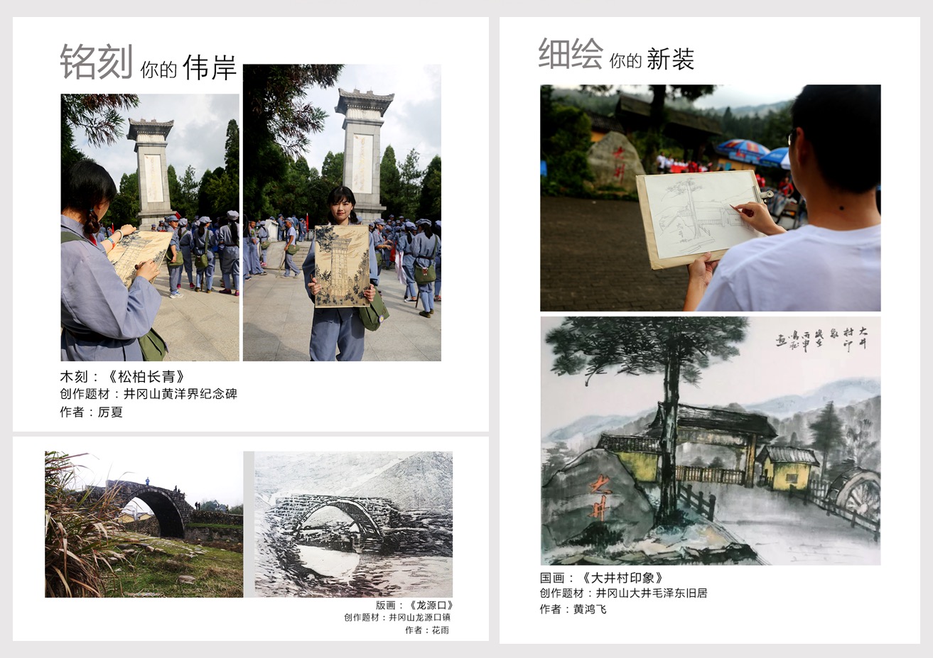 今年8月初,艺术学院12名师生获得团中央2016年“井冈情•中国梦”全国大学生暑期实践季专项行动立项支持,成为全校唯一一支国家级实践团队,在学院教授张天星的带领下,奔赴革命圣地井冈山,开展以“井冈逐梦”为主题的革命历史寻访调研与版画创作实践活动。团队成员通过在团中央井冈山教育基地的“井冈丰碑”音像教学、“三湾改编”情景教学、“祭奠井冈英烈”仪式教学、朱毛红军挑粮小道体验教学、“革命后代讲家风”互动教学,以及大井朱毛旧居、八角楼、黄洋界现场教学等课程的学习,调研走访了井冈山革命博物馆、井冈山会师纪念馆、步云山练兵场、红军医院等地,结合自己的亲身体验和感悟,创作出了《红四军人物》、《井冈山印象》、《浩气长存》、《龙源口》等近二十幅版画与国画作品。在中国共产党成立95周年之际,用艺术的形式铭记党史,弘扬革命精神,传承红色基因。