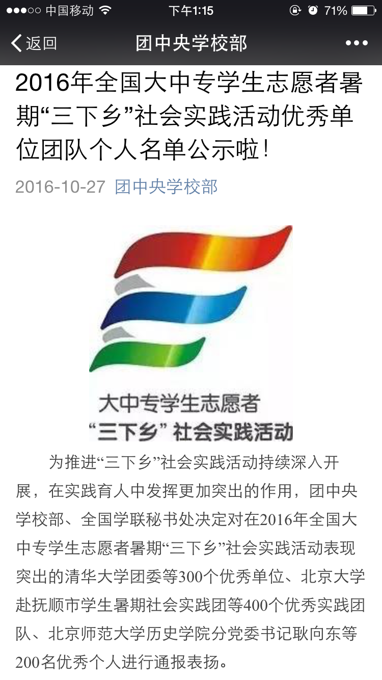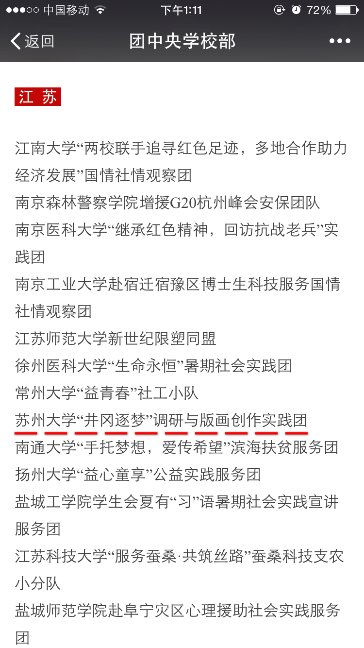10月27日,团中央学校部、全国学联秘书处公布2016年全国大中专学生志愿者暑期“三下乡”社会实践活动优秀单位、优秀实践团队和优秀个人名单,对活动中表现突出的团体和个人进行通报表扬。苏州大学艺术学院的“井冈逐梦”井冈山革命历史寻访调研与版画创作实践团获评全国优秀团队。