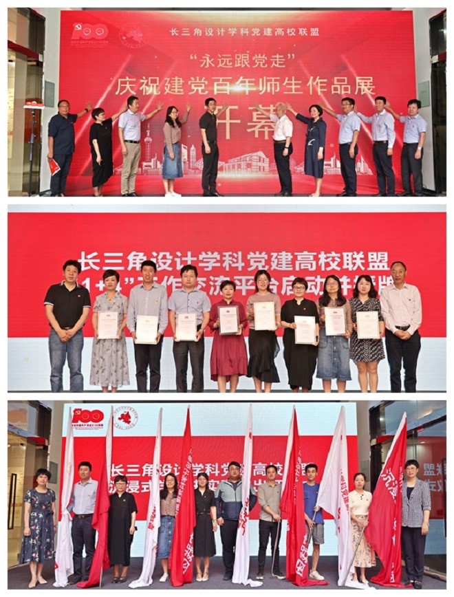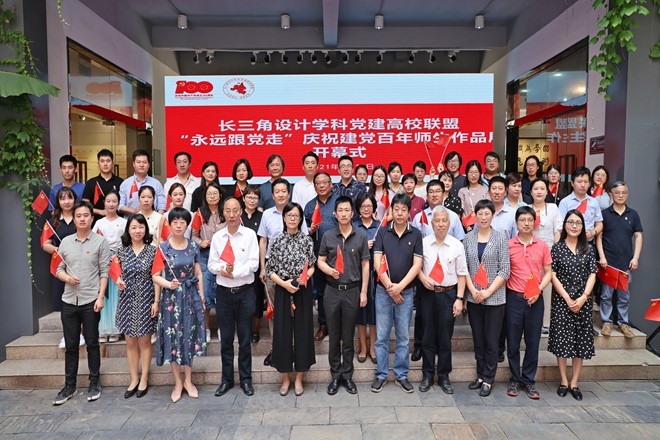 江南大学校党委副书记戴月波、设计学院首任院长张福昌与党建联盟8所单位领导,共同为“永远跟党走——庆祝建党百年师生作品展”揭幕。