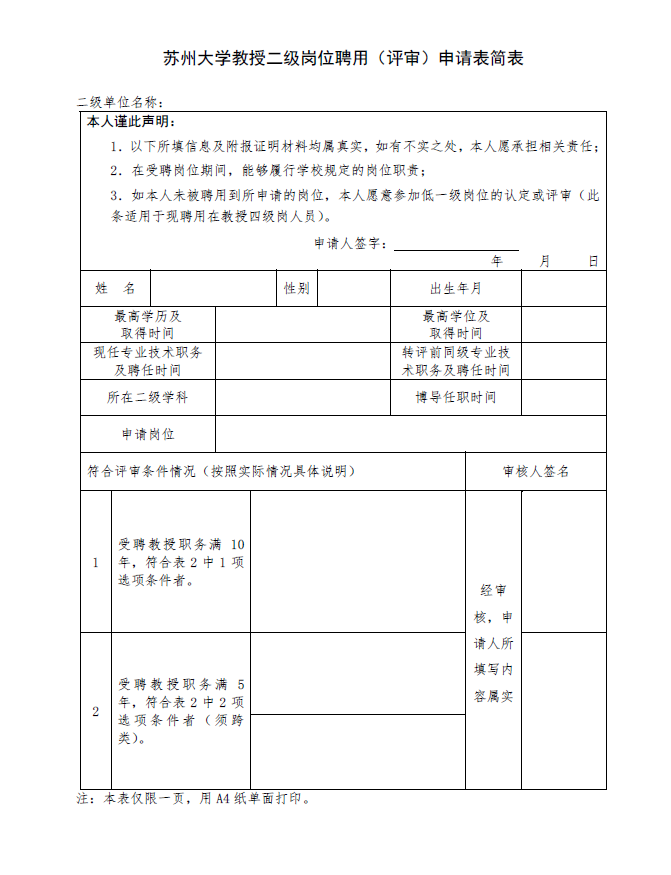 附件下载:http://ysxy.suda.edu.cn/attached/upfile/苏州大学教授二级岗位聘用(评审)申请表简表.doc