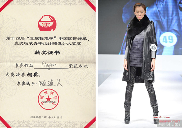 9月19日,第十四届“真皮标志杯”中国国际皮革、裘皮服装青年设计师大奖赛决赛在浙江海宁举行。艺术学院09级服装艺术设计班温兆阳同学以其作品《骑士的自由》取得名列全场第二的好成绩,荣获本次大赛银奖;08级服装艺术设计班的随逍笑同学的作品《players》 以第六名的成绩获得大赛铜奖。